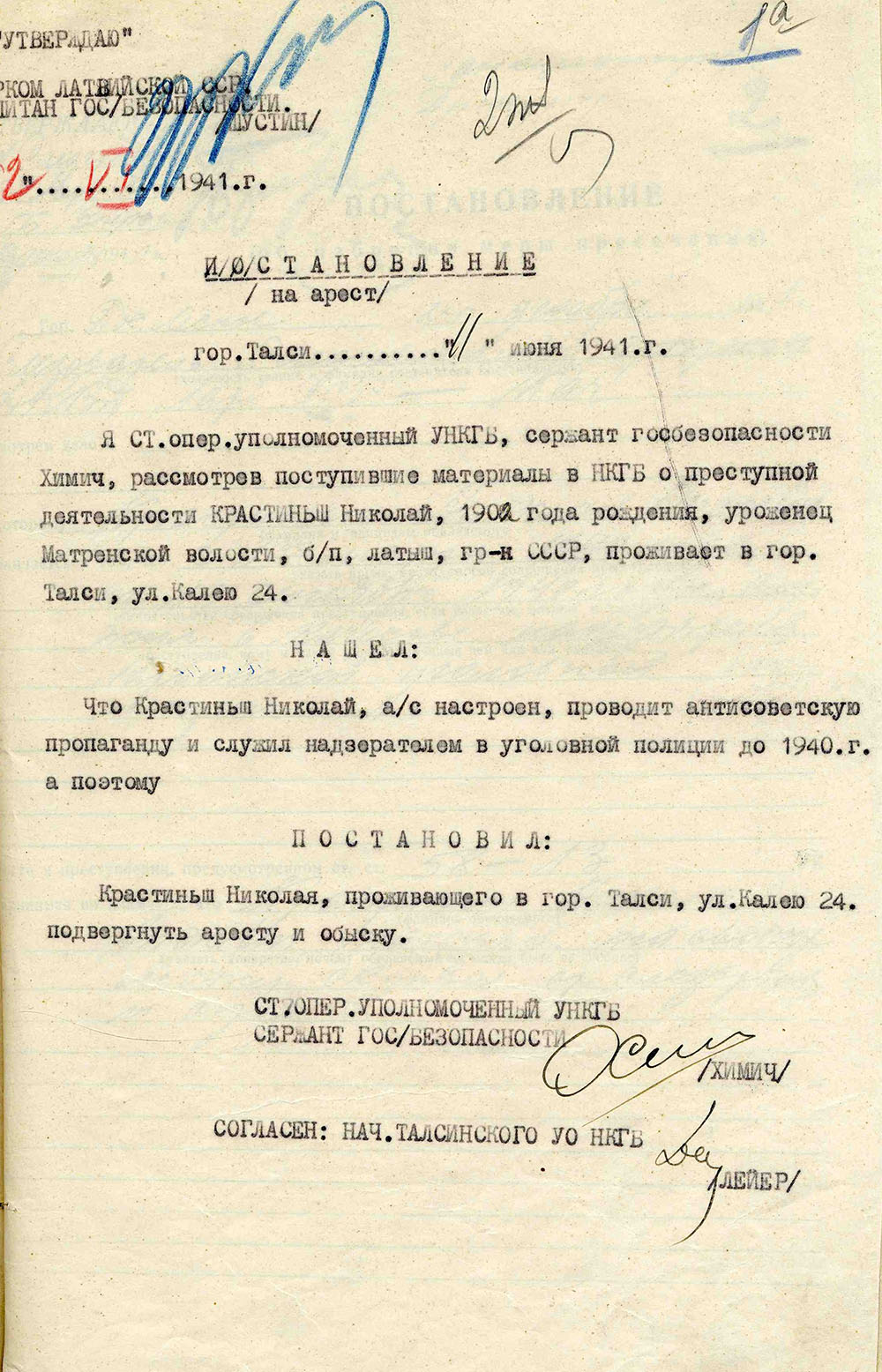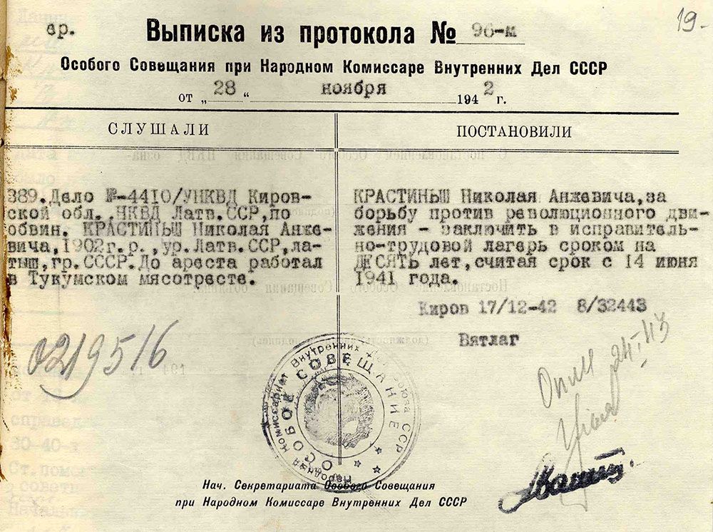 Veltas Vijas Krastiņas ģimeneKrastiņa Velta Vija Nikolaja m., dz. 1935, dzīvoja Talsos, Kalēju ielā 24, izsūtīta 14.06.1941. uz Krasnojarskas novada Kazačinskas rajonu, atbrīvota 29.09.46. Lieta Nr. 16750. Tēvs Krastiņš Nikolajs Andža d., dz. 1902, dzīvoja Talsos, Kalēju ielā 24, arestēts 14.06.1941., ieslodzīts Kirovas apgabala Vjatlagā, pēc tam nometinājumā uz Krasnojarskas novada Kazačinskas rajonu, atbrīvots 03.06.57. Lieta Nr. 16750. Māte Krastiņa Elza Vilhelmīne Vilhelma m., dz. 1912, dzīvoja Talsos, Kalēju ielā 24, izsūtīta 14.06.1941. uz Krasnojarskas novada Kazačinskas rajonu, mirusi 19.03.44. Lieta Nr. 16750. Māsa Krastiņa Līga Māra Nikolaja m. dz. 1938, dzīvoja Talsos, Kalēju ielā 24, izsūtīta 14.06.1941. uz Krasnojarskas novada Kazačinskas rajonu, atbrīvota 15.05.57. Lieta Nr. 16750. |