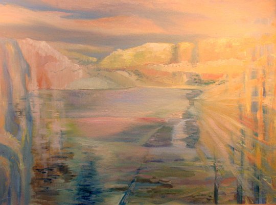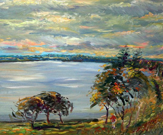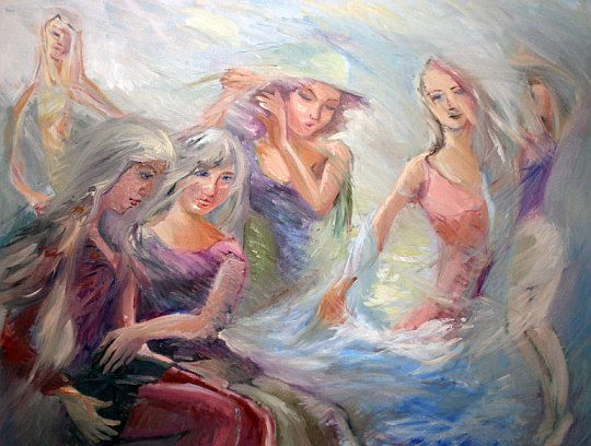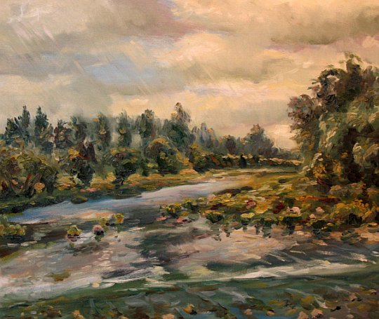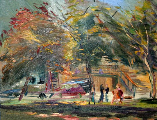Neoimpresionisma stilā ar gaismas spēli un figūru interpretāciju. Vides un iespaidu tēlojums.