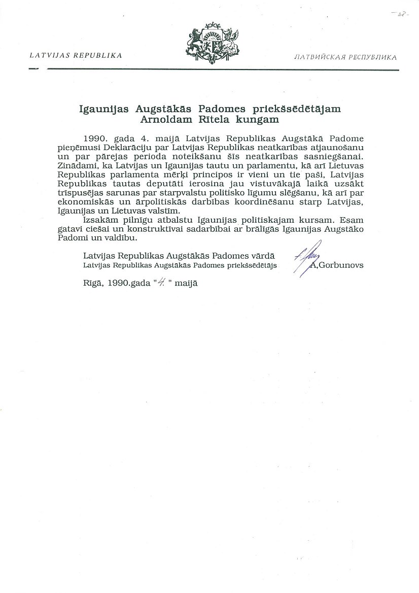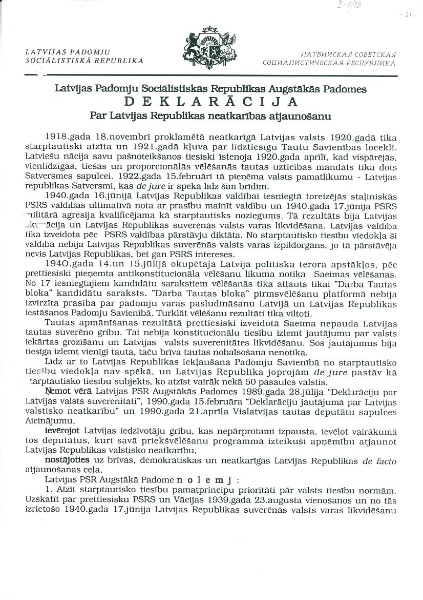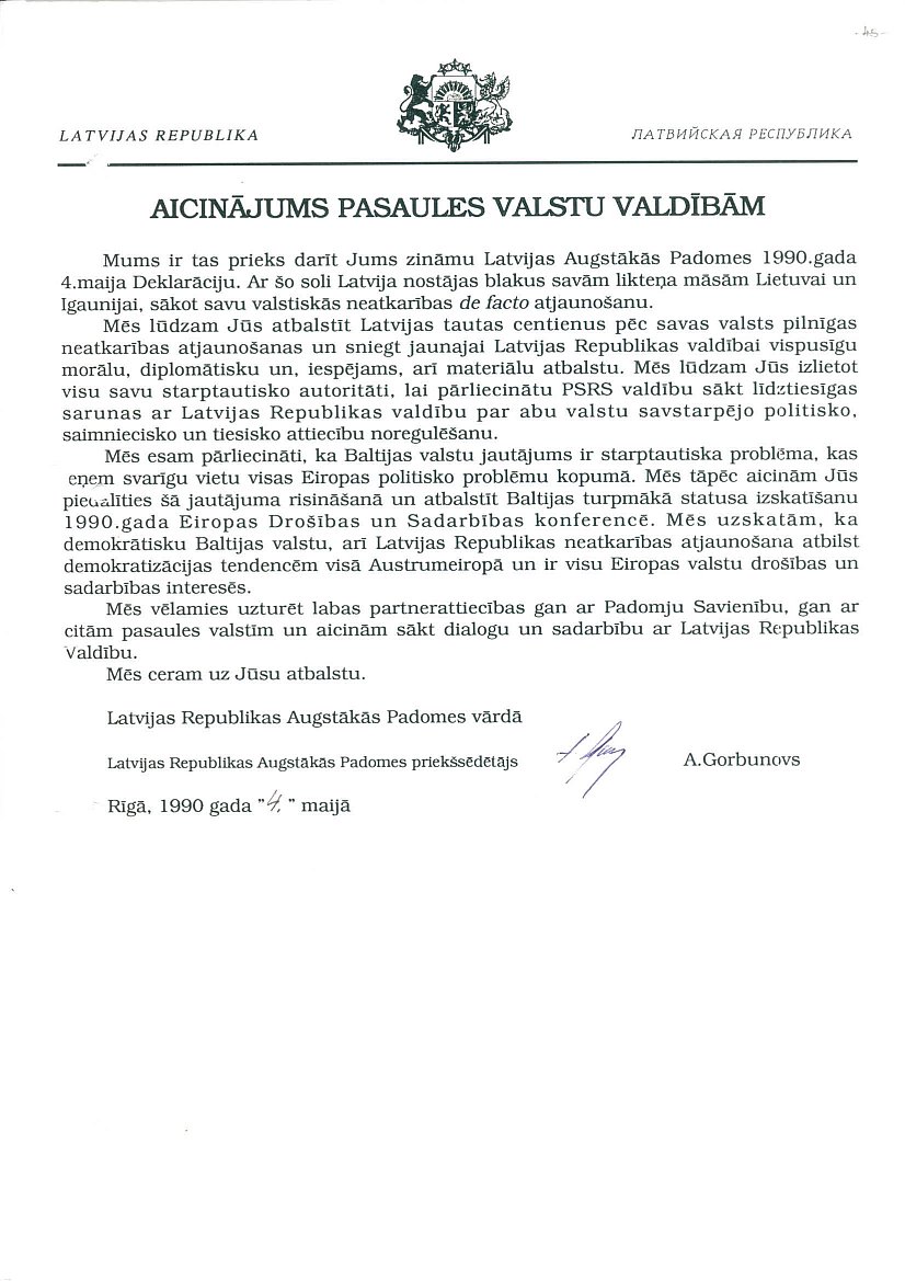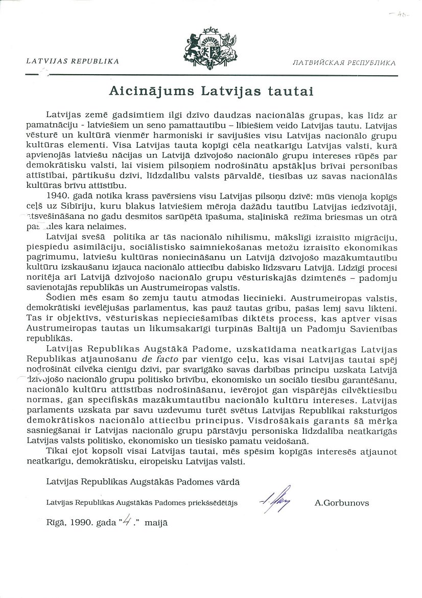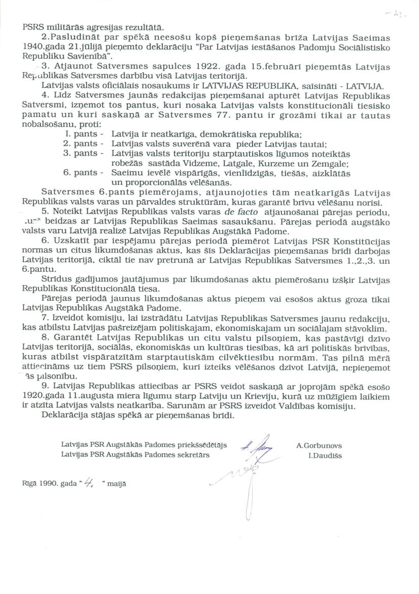 Latvijas PSR Augstākās Padomes 1990. gada 4. maijā pieņemtā Deklarācija "Par Latvijas Republikas neatkarības atjaunošanu".