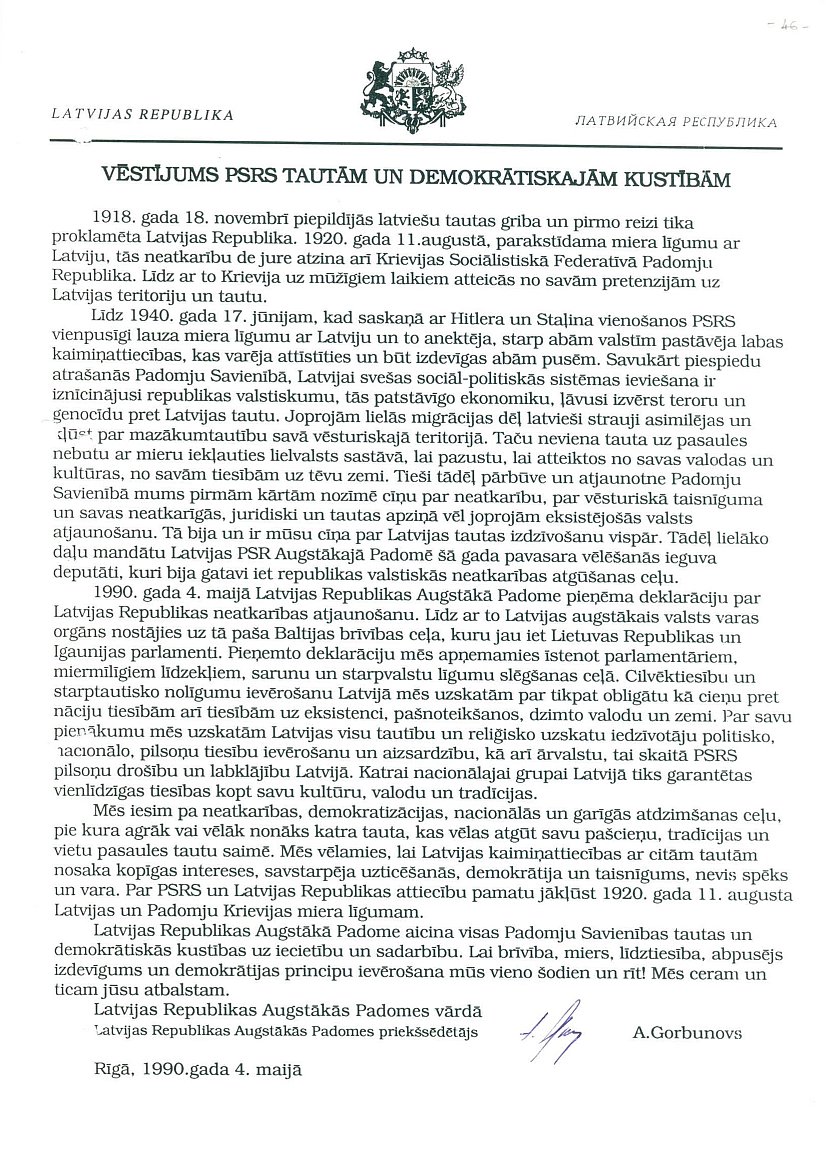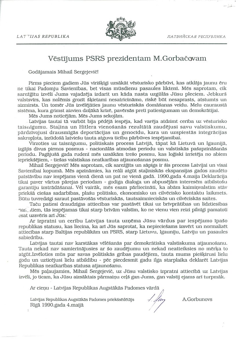 Latvijas Republikas Augstākās Padomes 1990. gada 4. maija Vēstījums PSRS prezidentam M. Gorbačovam.