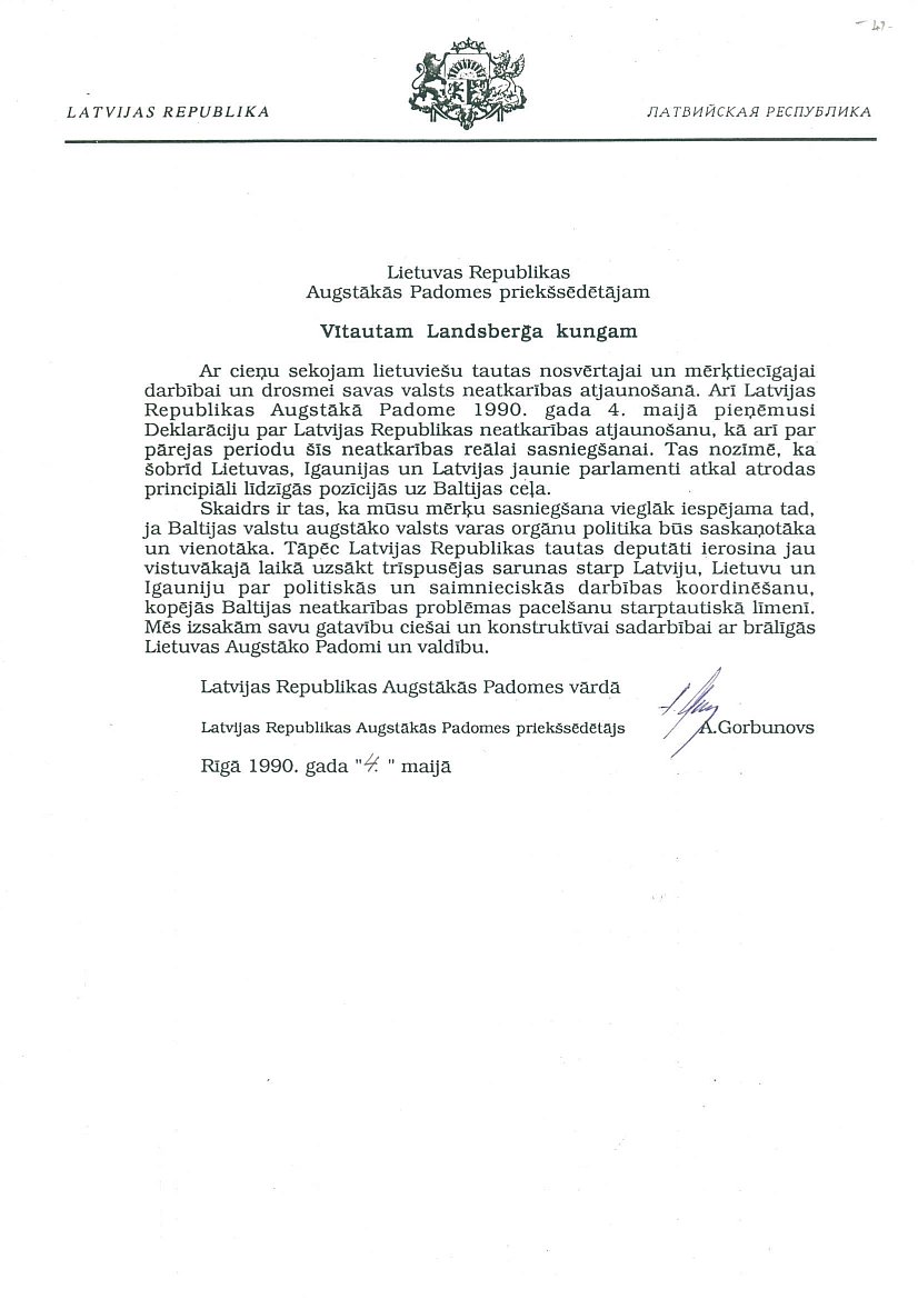 Latvijas Republikas Augstākās Padomes 1990. gada 4. maija Aicinājums Lietuvas Republikas Augstākās Padomes priekšsēdētājam V. Landsberģa kungam.