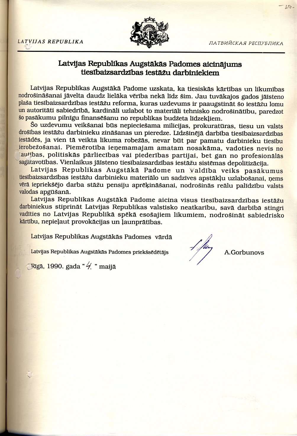 Latvijas Republikas Augstākās Padomes 1990. gada 4. maija Aicinājums tiesībaizsardzības iestāžu darbiniekiem.