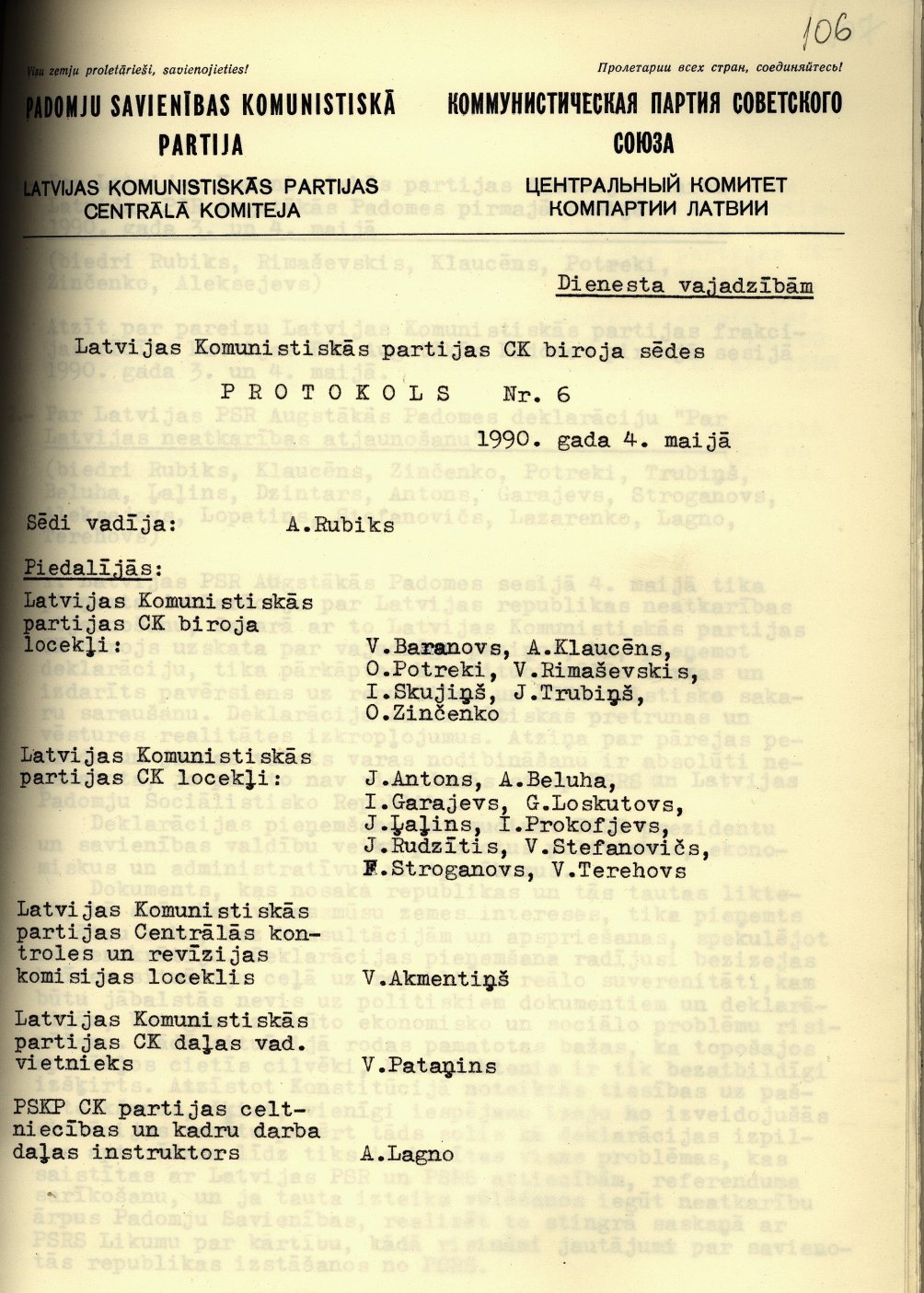 Latvijas Komunistiskās partijas Centrālās komitejas 1990. gada 4. maija biroja sēdes protokols Nr. 6 Par Latvijas PSR Augstākās Padomes deklarāciju Par Latvijas neatkarības atjaunošanu.
