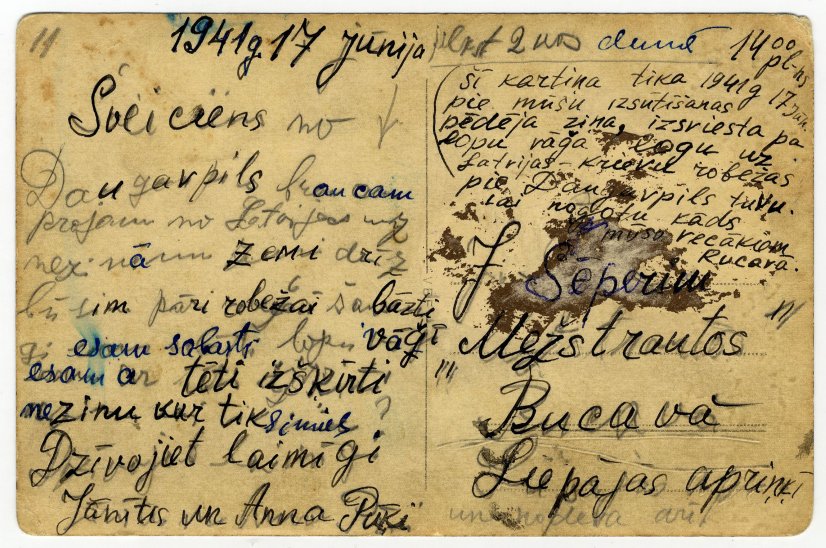 Šajā kolekcijā atrodas 1941. gada 17. jūnijā plkst. 2 dienā ešelonā rakstīta un no tā izmesta kartiņa, ko rakstījusi no Liepājas apriņķa Rucavas pagasta Krūmkalniem izsūtītā Anna Pūķe saviem vecākiem. |