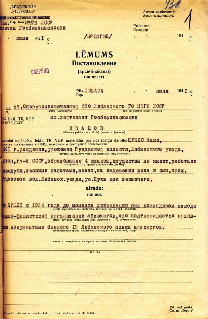 Lēmums par Pūķa Jāņa apcietināšanu. |