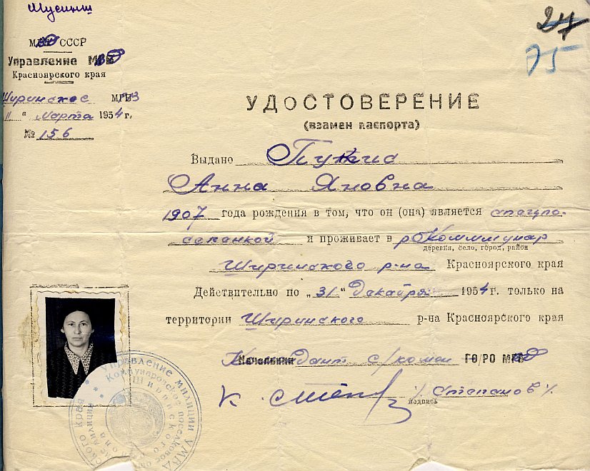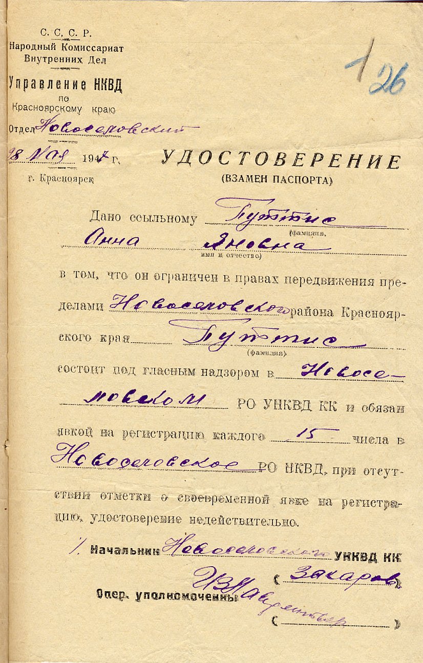 Tajā teikts, ka viņa drīkst brīvi pārvietoties tikai Krasnojarskas novada Novosjolovas rajona robežās, un katru mēnesi viņai jāierodas uz reģistrāciju Iekšlietu tautas komisariāta rajona nodaļā. |