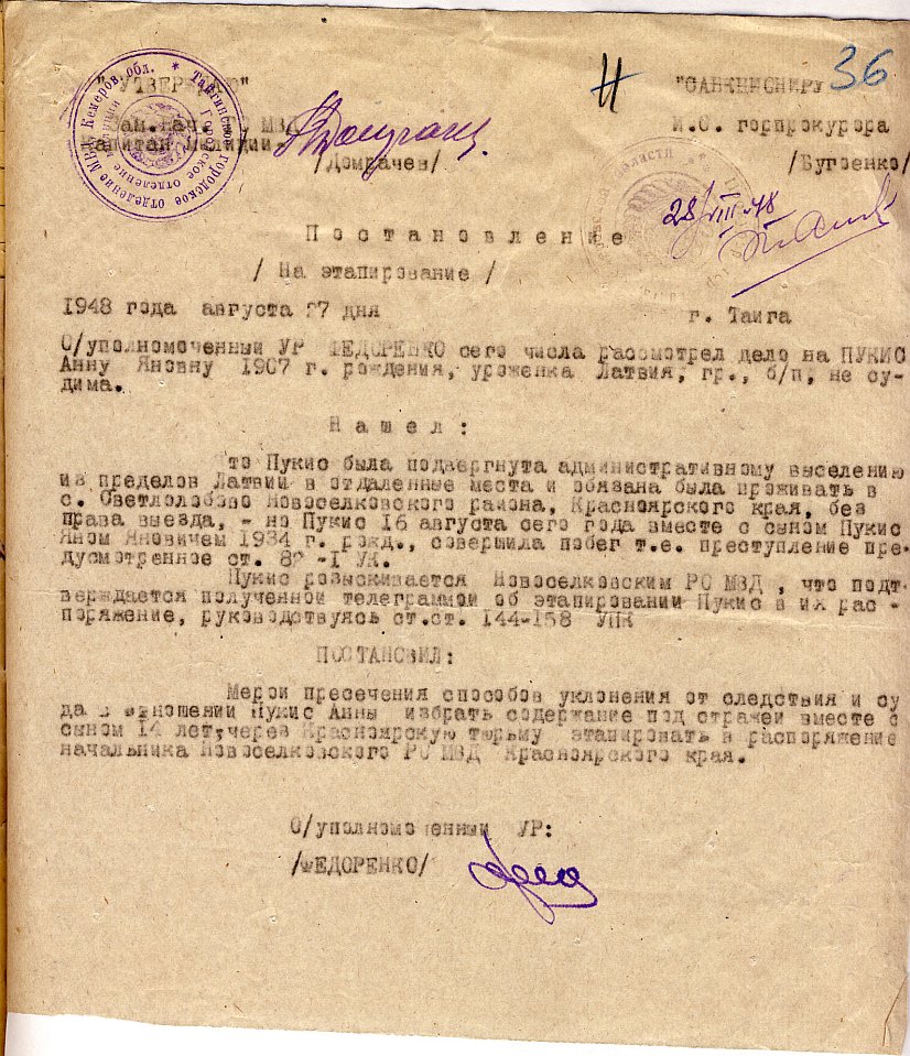 Tajā teikts, ka Pūķis Anna tika izsūtīta un viņai bija jādzīvo Krasnojarskas novada Novosjolovas rajonā. 1947. gada 16. augustā Anna kopā ar dēlu Jāni bēga, tādejādi izdarot noziegumu pēc kriminālkodeksa 82. panta. |