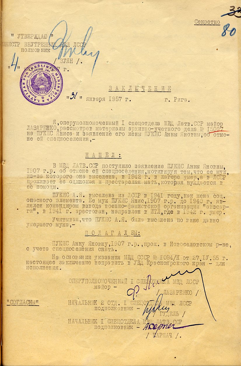 Latvijas PSR iekšlietu ministra 1957. gada 4. janvārī apstiprināts slēdziens par Pūķis Annas noņemšanu no specnometinājuma uzskaites. |