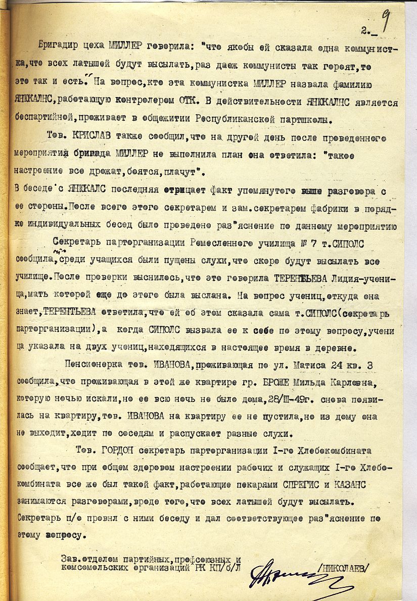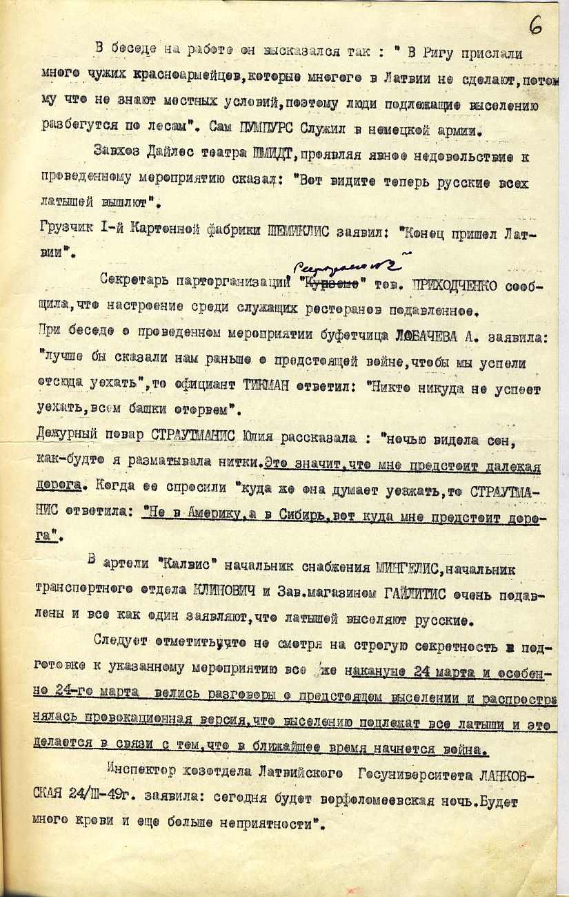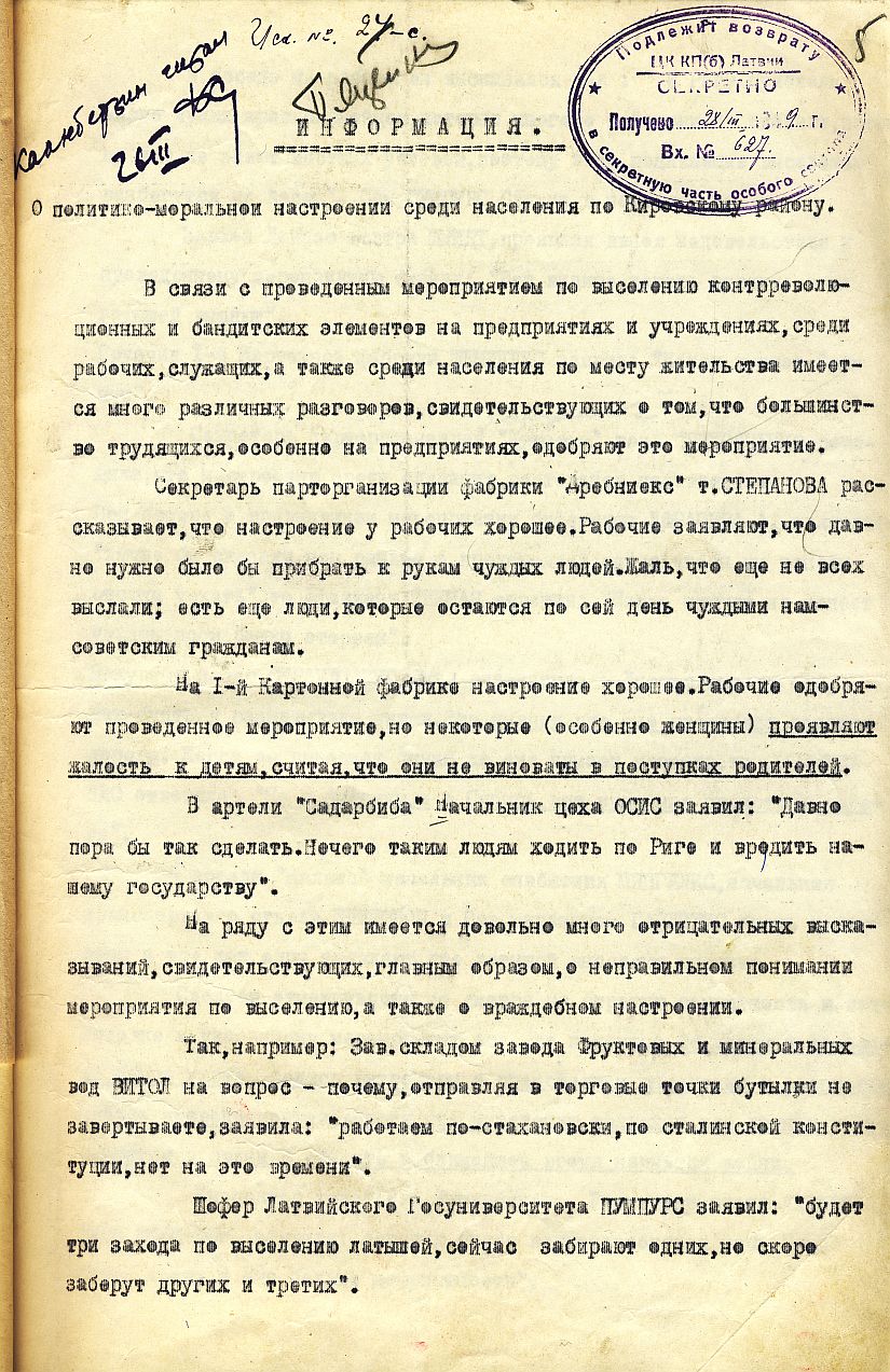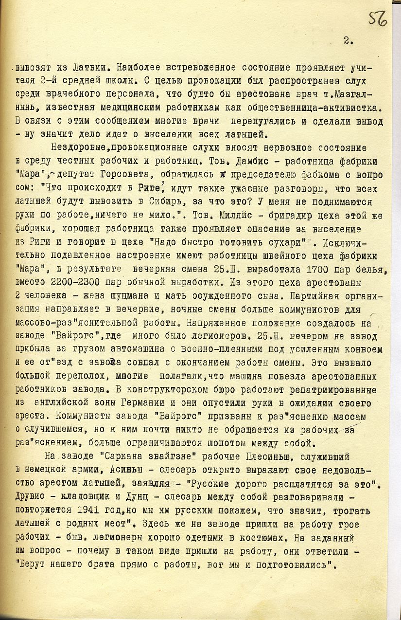 "Maizes kombināta partijas organizācijas sekretārs b. Gordons ziņo, ka vispārējais strādnieku un kalpotāju noskaņojums 1. Maizes kombinātā veselīgs. Tomēr bijis fakts, ka ceptuvē strādājošie Spreģis un Kazans sarunājušies it kā visus latviešus izsūtīs. Partijas organizācijas sekretārs pārrunājis ar viņiem un devis šai jautājumā attiecīgus izskaidrojumus."