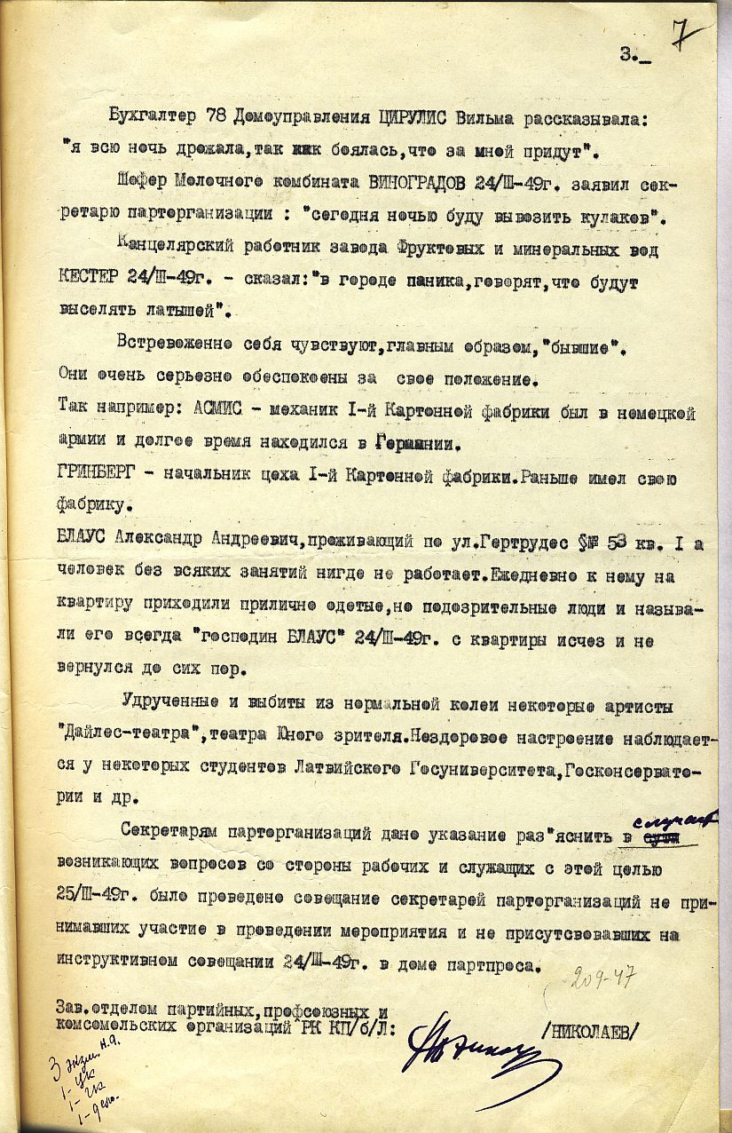 "Partijas organizāciju sekretāriem doti norādījumi izskaidrot strādniekiem un kalpotājiem radušos jautājumu būtību. Šajā nolūkā 1949. gada 25. martā tika sasaukta to partijas organizāciju sekretāru sanāksme, kuri nepiedalījās pasākumā un nebija klāt instruktīvajā sanāksmē, partijas izglītības namā 1949. gada 24. martā."