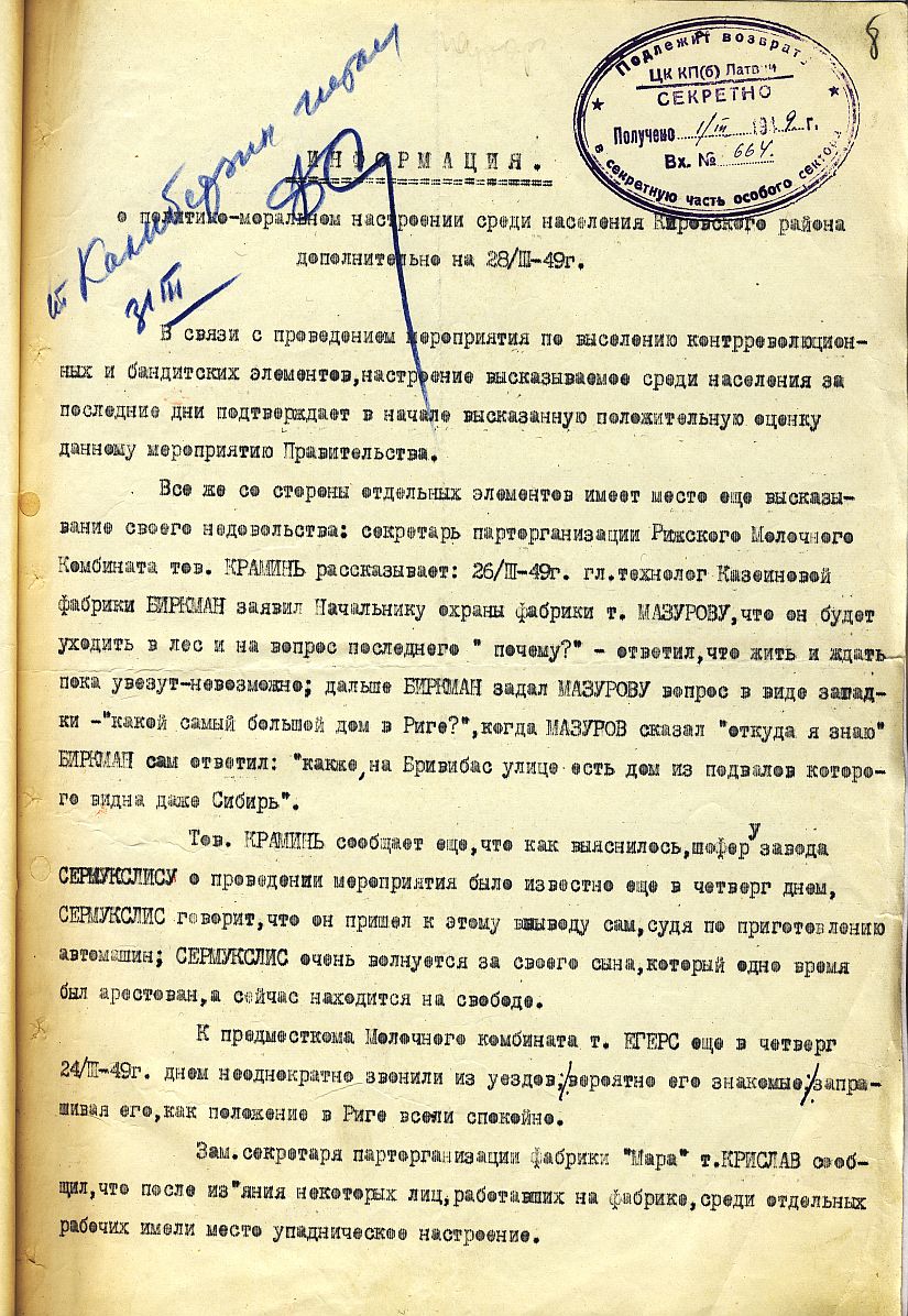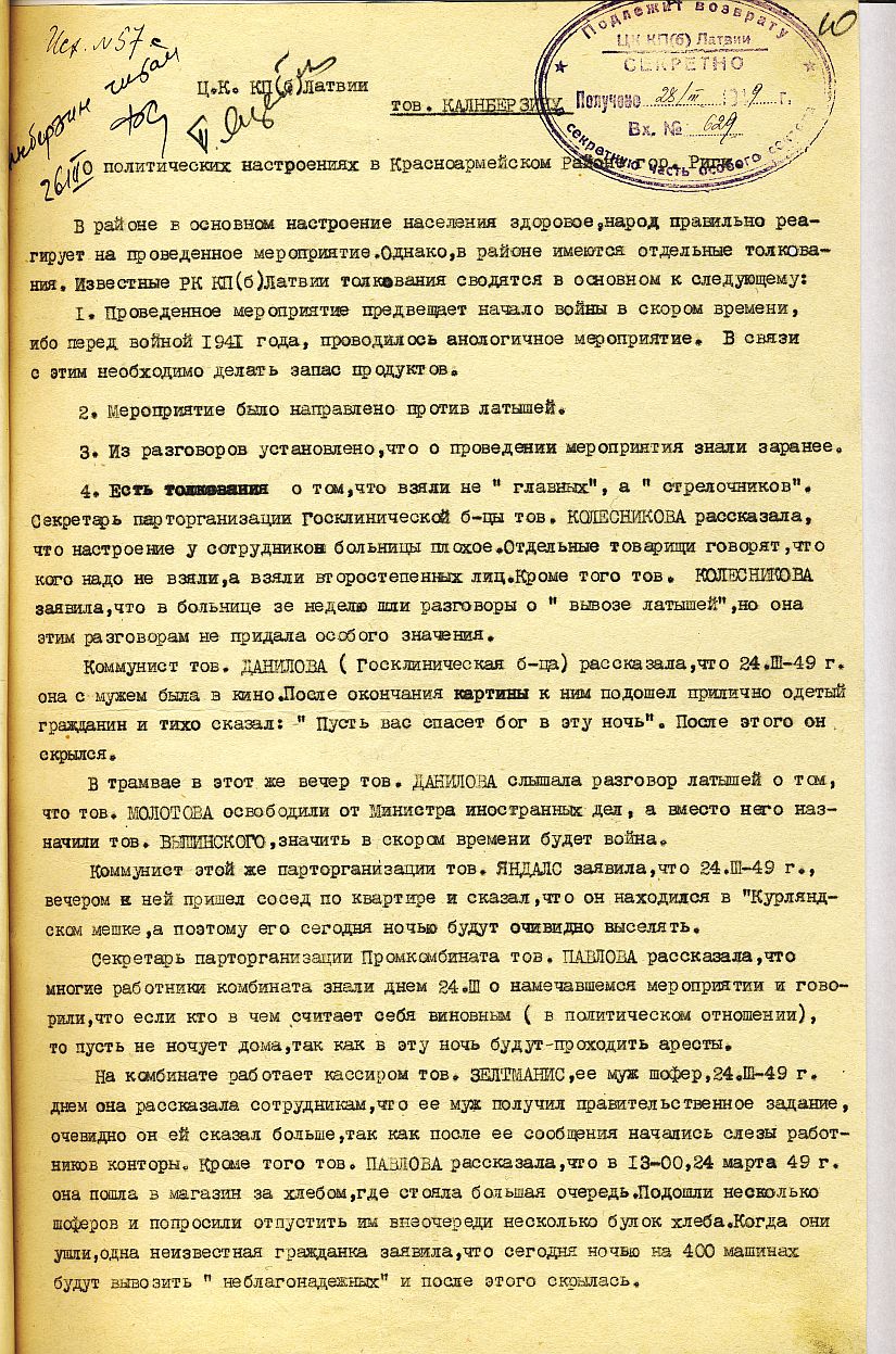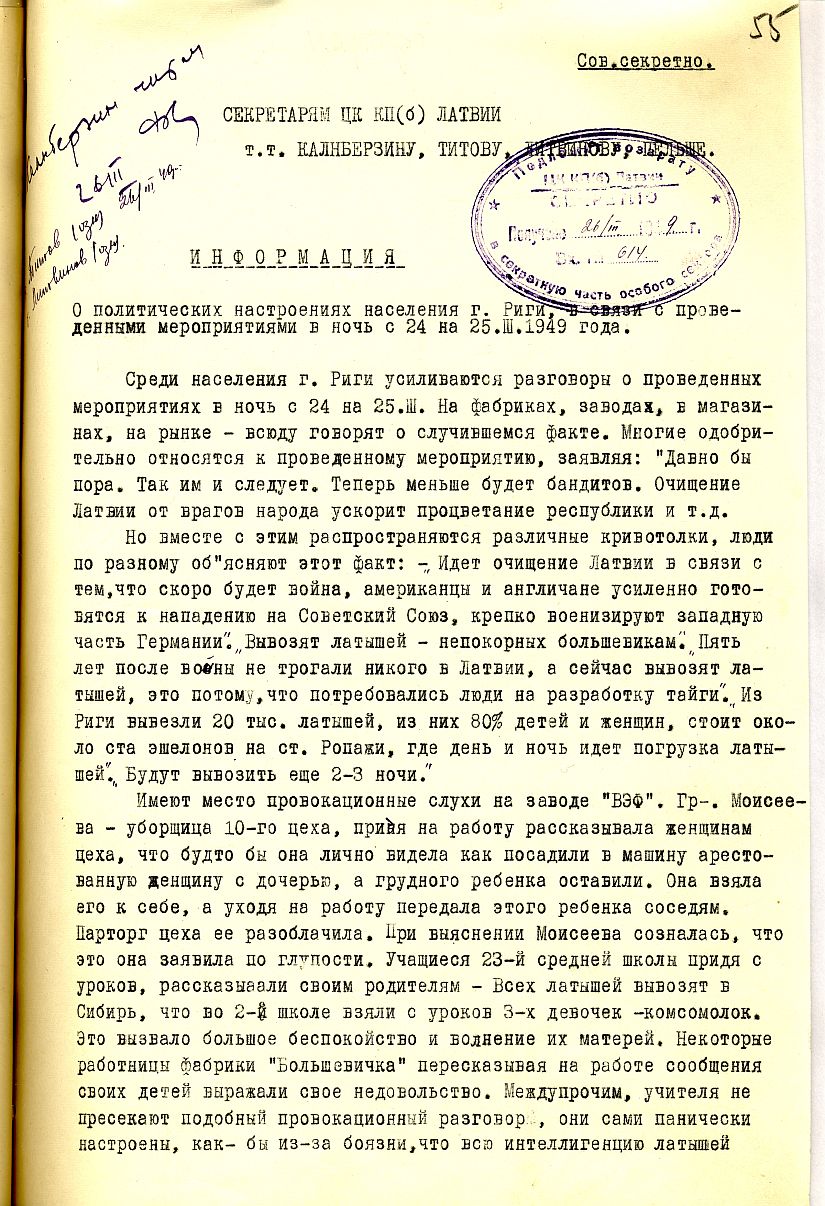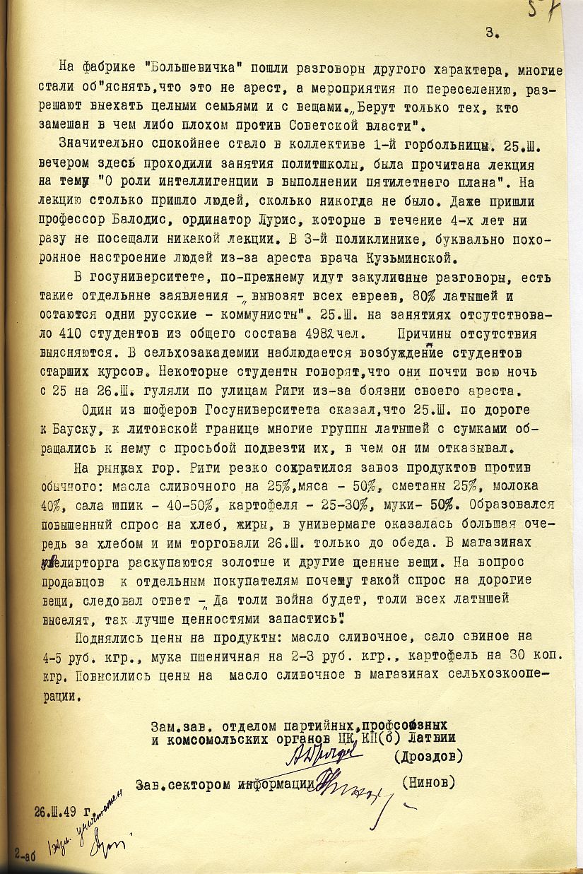 | LK(b)P CK partijas, arodbiedrību un komjaunatnes organizāciju nodaļas vadītāja vietnieka Drozdova un informācijas sektora vadītāja Ņinova informācija LK(b)P CK sekretāriem Kalnbērziņam, Titovam, Ļitvinovam, Pelšem par Rīgas pilsētas iedzīvotāju politisko noskaņojumu sakarā ar pasākumiem naktī uz 24. un 25. martu. 1949. gada 26. martā.