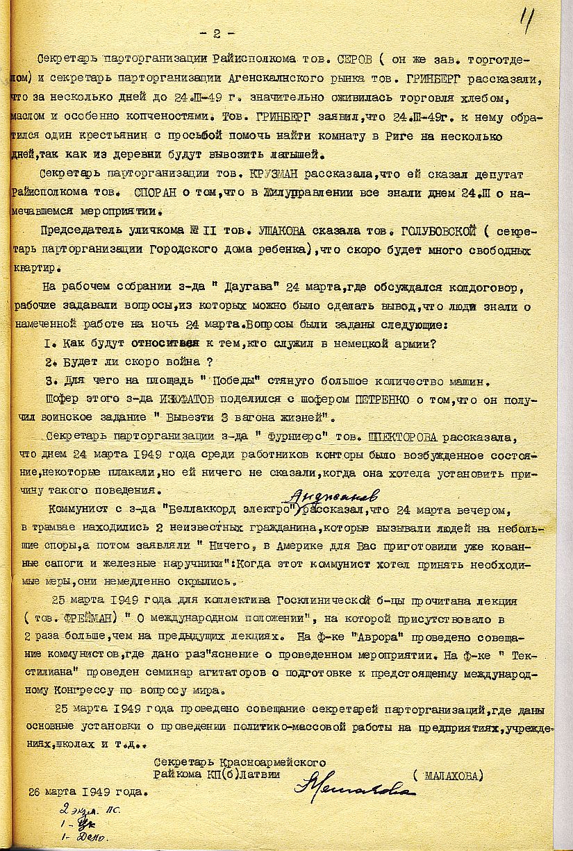 LK(b)P Rīgas pilsētas Sarkanarmijas rajona komitejas sekretāres Malahovas slepenā informācija LK(b)P CK pirmajam sekretāram Jānim Kalnbērziņam par iedzīvotāju politisko noskaņojumu Sarkanarmijas rajonā 1949. gada 26. martā.