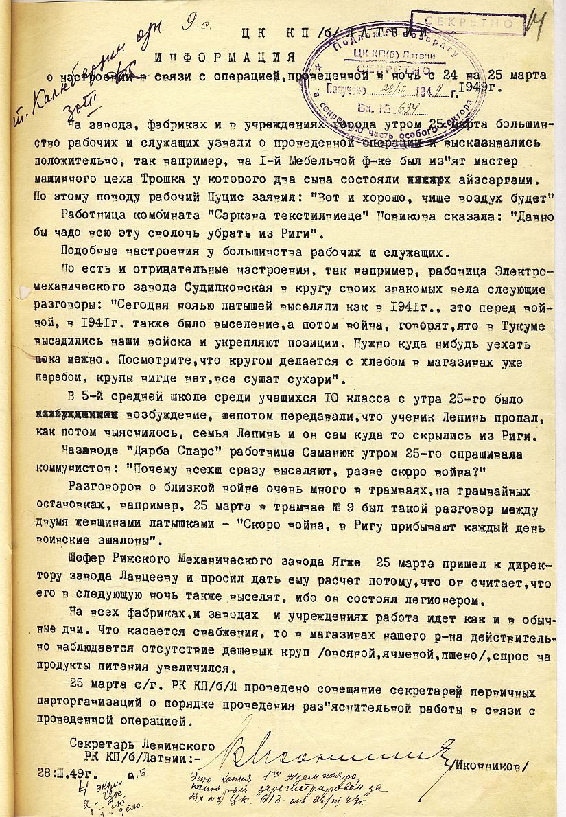 LK(b)P Rīgas pilsētas Ļeņina rajona komitejas sekretāra Ikoņņikova slepenā informācija LK(b)P CK un LK(b)P Rīgas pilsētas komitejai par iedzīvotāju politisko noskaņojumu Ļeņina rajonā sakarā ar operāciju naktī no 1949. gada 24. uz 25. martu. 1949. gada 28. martā.