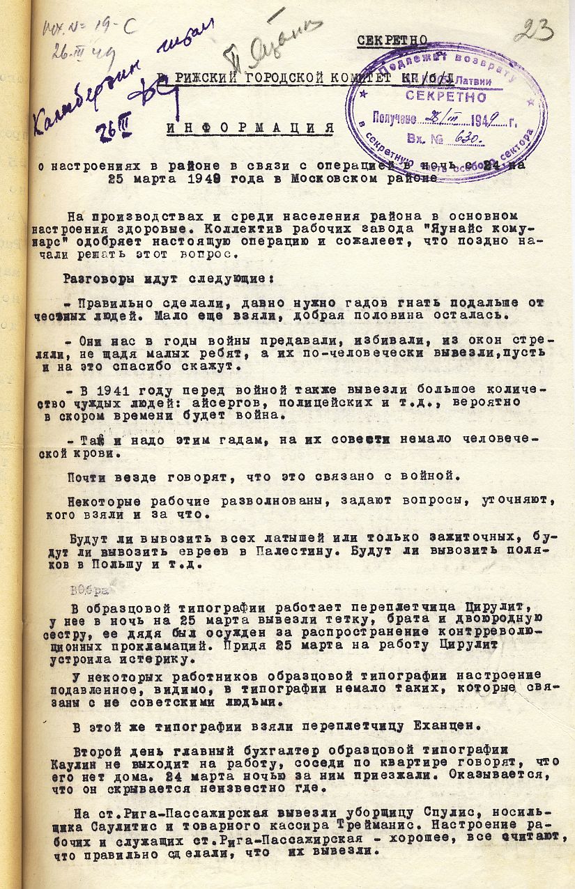 "Rīgas iedzīvotāju vidū pastiprinās pārrunas par naktī no 24. uz 25. III veiktajiem pasākumiem. Fabrikās, rūpnīcās, veikalos, tirgū visur runā par notikušo faktu."