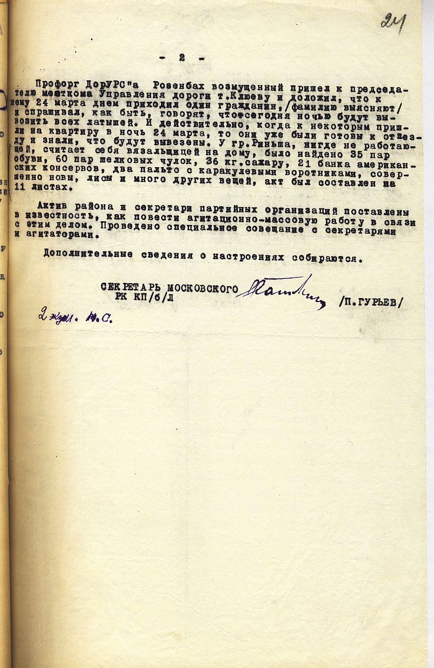 LK(b)P Rīgas pilsētas Maskavas rajona komitejas sekretāra P. Gurjeva slepenā informācija LK(b)P Rīgas pilsētas komitejai par iedzīvotāju politisko noskaņojumu Maskavas rajonā pēc operācijas naktī uz 25. martu. 1949. gada 26. martā.