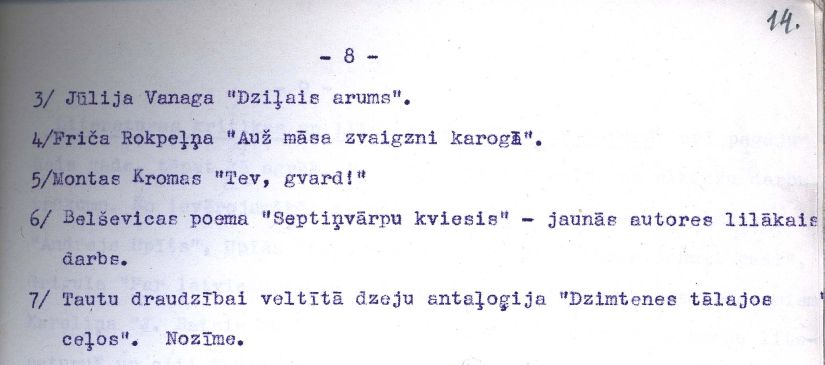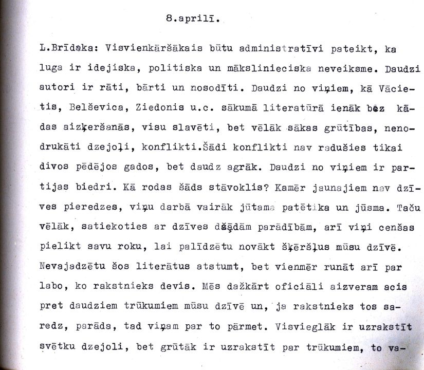 Ieskatam piedāvājam atsevišķus dokumentus un to fragmentus no Latvijas Rakstnieku savienības (473. fonds), Latvijas Padomju rakstnieku savienības Latvijas Komunistiskās partijas (LKP) pirmorganizācijas (PA-7263. fonds), Latvijas Komunistiskās partijas Centrālā Komitejas (PA-101. fonds), Izdevniecības "Liesma" (478. fonds) un Izdevniecības "Liesma" LKP pirmorganizācijas (PA-885. fonds).