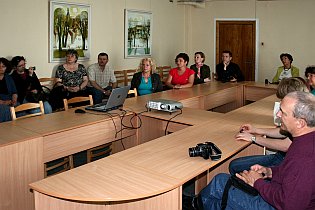 16.aprīļa pēcpusdienā pie LVA darbiniekiem viesojās Jēkabpils mākslinieks Ziedonis Bārbals, kurš atraisītā sarunā iepazīstināja klātesošos ar savu darbu izstādi. Mākslinieks stāstīja gan par sižetu izvēli, gan gleznotāja ikdienas melno darbu, par kuru skatītājs pat nenojauš, jo redz tikai gatavo gala rezultātu. Z.Bārbals ir arī Jēkabpils Mākslas skolas direktors un viņa kolēģe grafiķe Daina Eglīte papildināja stāstījumu ar savu redzējumu par mākslu kultūras norisēm.