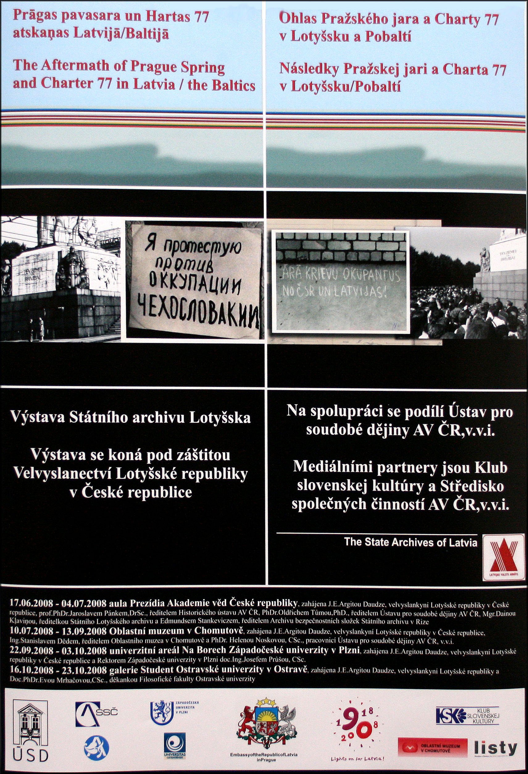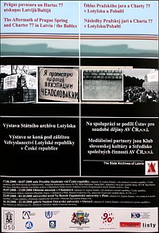 2008. gada 17. jūnijā plkst.18.00 Čehijas Zinātņu Akadēmijas Prezidija aulā Prāgā, Narodni ielā 3 tiks atklāta Latvijas Valsts arhīva veidotā izstāde "Prāgas pavasara un Hartas 77 atskaņas Latvijā/Baltijā". Izstāde, sadarbojoties Latvijas Valsts arhīvam, Latvijas Republikas vēstniecībai Čehijā un Čehijas Zinātņu Akadēmijas Jaunāko laiku vēstures institūtam, iekļauta 16.-17.jūnijā Prāgā notiekošās starptautiskās konferences "1968. gada Prāgas pavasaris. Sabiedrība. Mēdiji. Politisko un kultūras procesu pārveide" programmā. Šī gada laikā Čehijā izstāde būs aplūkojam arī Česke Budejovices, Ostravas Universitātēs un Homutovas apgabala muzejā.