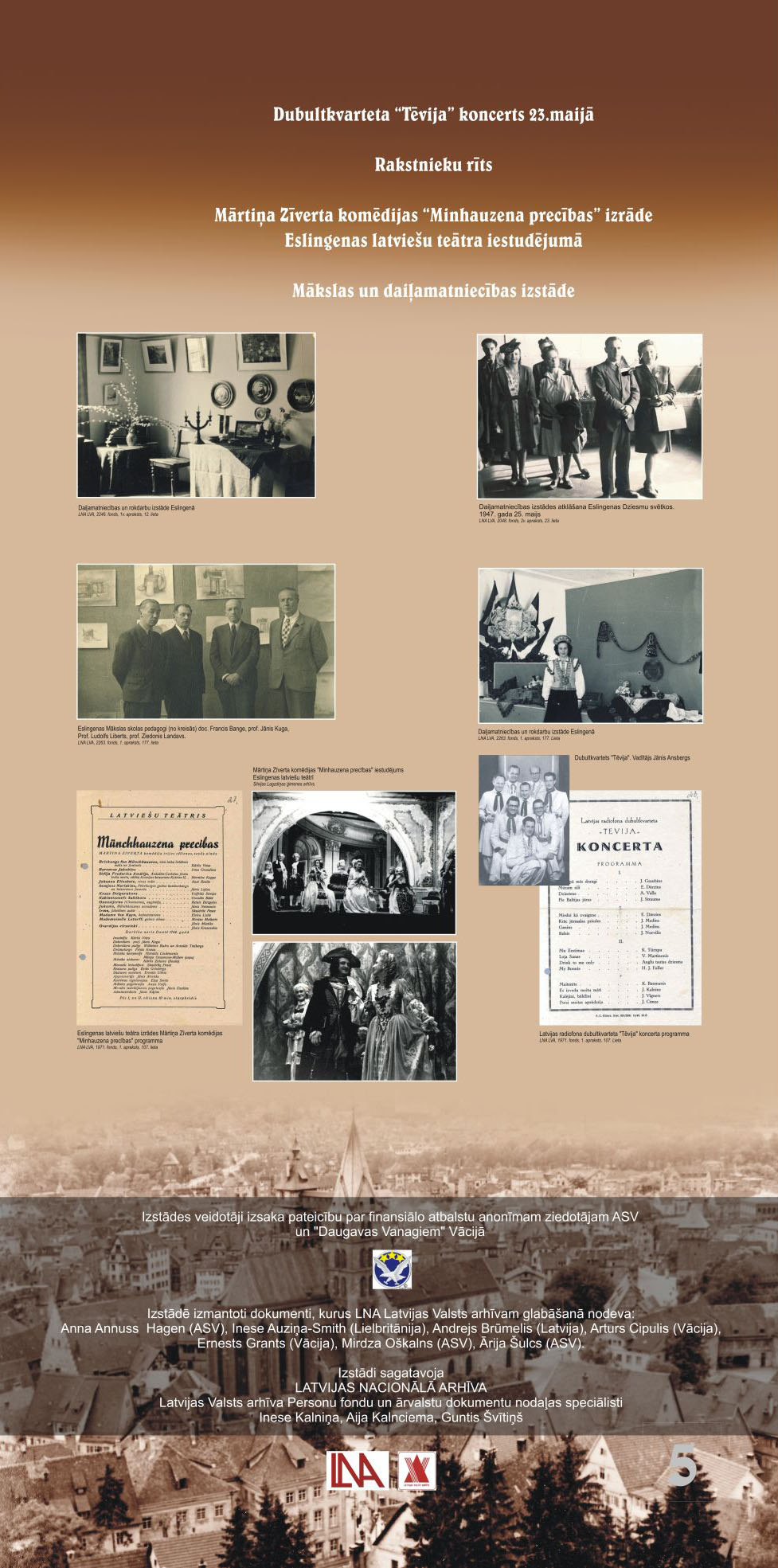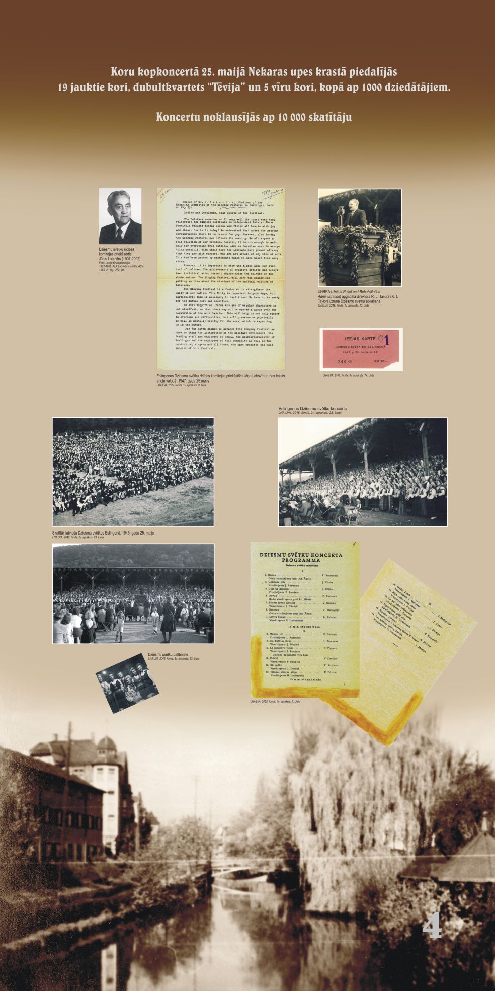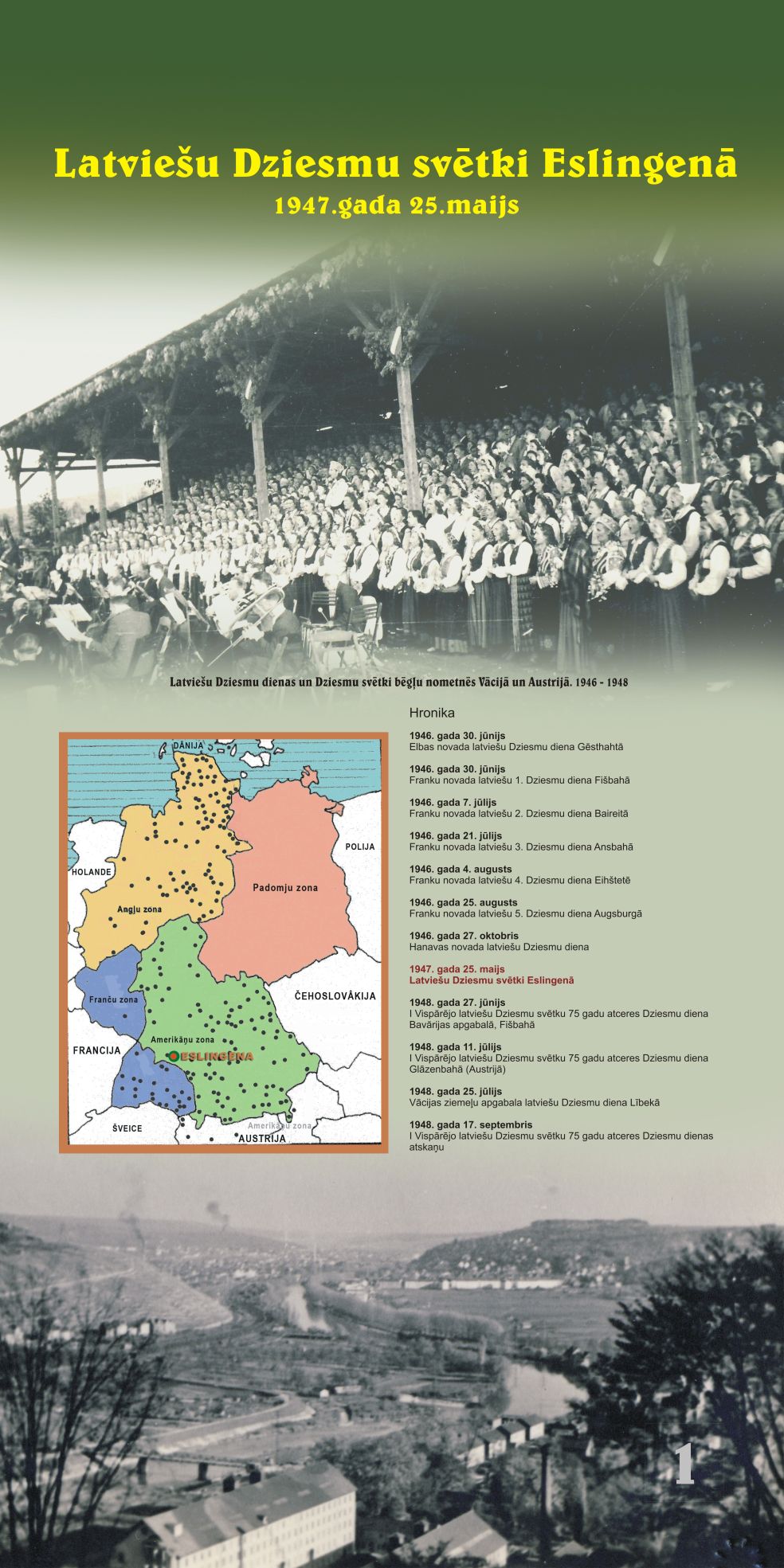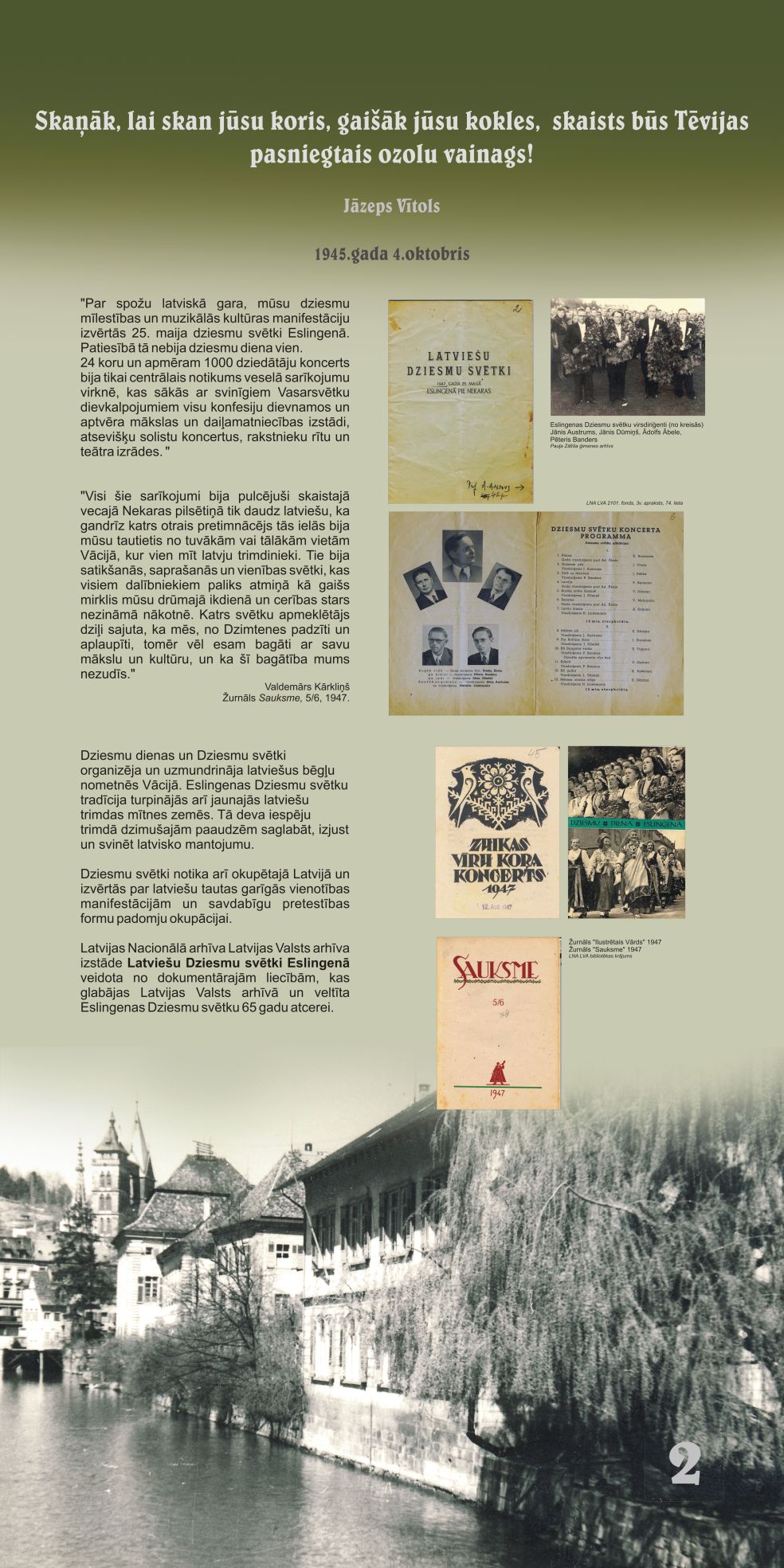 LNA Latvijas Valsts arhīva (LVA) vestibilā Bezdelīgu ielā 1 apskatāma ceļojošā izstāde Latviešu Dziesmu svētki Eslingenā 1947.gada 25.maijā, kas bija eksponēta Freiburgā, Minsterē un Anabergā (Vācija).