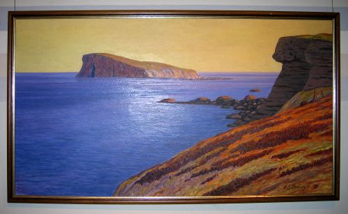 Latvijas ainavu un jūrmalas skatu gleznojumi, kalnu ainavas un fantāzijas tēlojumi.