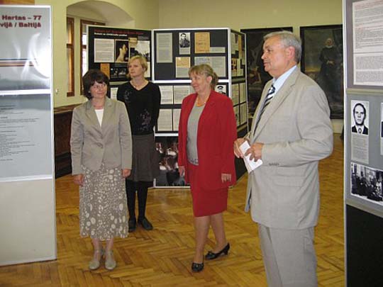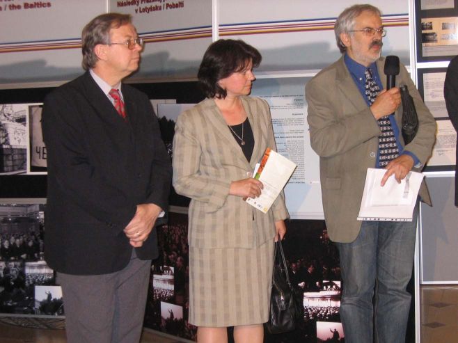 A speech was given by the Lithuanian President Dalia Grybauskaite at the opening ceremony of the exhibition. The event was opened with a speach of Birute Burauskaite, Director General of the Lithuanian Genocide and Resistance Center. The welcome speech in Lithuanian was given by the ambassador of the Republic of Latvia in Lithuania, Hardijs Baumanis. The ambassador of the Republic of Latvia in Czech Republic, Argita Daudze, and the author of the exhibition, Ritvars Jansons, guided a tour of the exhibition for the Lithuanian President Dalia Grybauskaite. The exhibition opening was attended by the ambassador of the Czech Republic in Lithuania, Alojz Buhta, Lithuanian dissidents, who signed the Baltic Charter, and the employees of the Museum of Genocide Victims and many other.