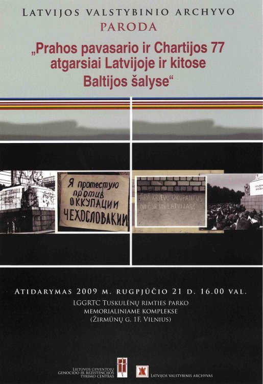 An exhibition “The Aftermath of Prague Spring and Charter 77 in Latvia/the Baltics” created by the State Archives of Latvia was opened on August 21, 2009 in Vilnius in the exhibition hall of Tuskulenai Peace Park Memorial of Lithuanian Genocide and Resistance Research Centre.