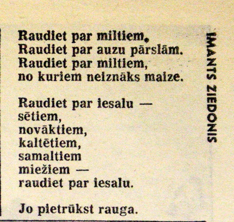 Author Arvīds Grigulis' speech against a poem by Imants Ziedonis published in the newspaper “Padomju Jaunatne” at the December 9, 1968, writers' meeting attended also by party employees: “While Voldemārs Krustiņš, the managing editor of the newspaper “Padomju Jaunatne”, was serving in the Soviet army and fulfilling his duties as a political civil servant in Czechoslovakia, the newspaper published the poem “Raudiet par miltiem, raudiet par auzu pārslām, raudiet par iesalu, jo pietrūka rauga” (Cry over the flour, cry over the oat flakes, cry over the malt, because there was no yeast). After the publication of the poem I had the opportunity to meet with some rural people, and I had a hard time explaining to them that this poem had nothing to do with the situation in Czechoslovakia and its evaluation. Because that's the way it is: there is yeast, but no bread or beer comes of it...”