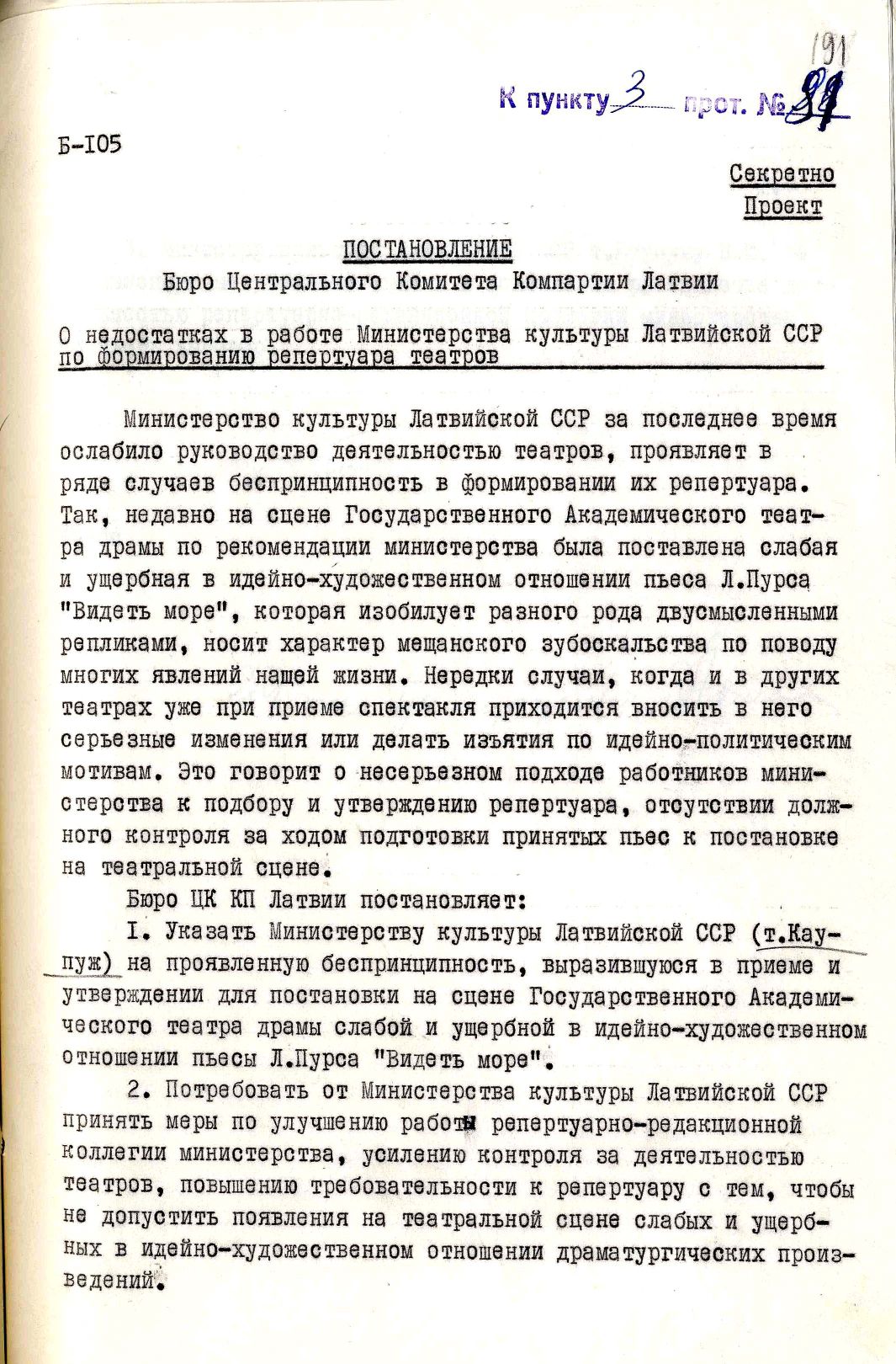 The March 26, 1968, project of decision by the LCP Central Committee bureau “Regarding the Latvian SSR Ministry of Culture's deficiencies in theater repertoire development”. The decision firmly reprimands Vladimirs Kaupužs, the Minister of Culture, for allowing a production of the “ideologically harmful” play “Redzēt jūru” by Laimonis Purs at the Academic Drama Theater. It also demands tighter control of the theater by the Ministry of Culture. As a result of this decision, several plays and films were cancelled or banned in Latvia.
