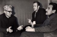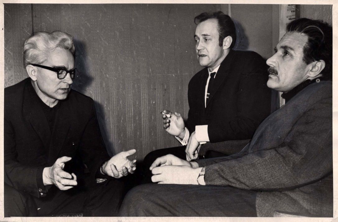 The Academic Drama Theater stages a production of Laimonis Purs' play “Redzēt jūru”. From the left: author Laimonis Purs, director Jūlijs Bebrišs, and actor Jānis Kubilis.
