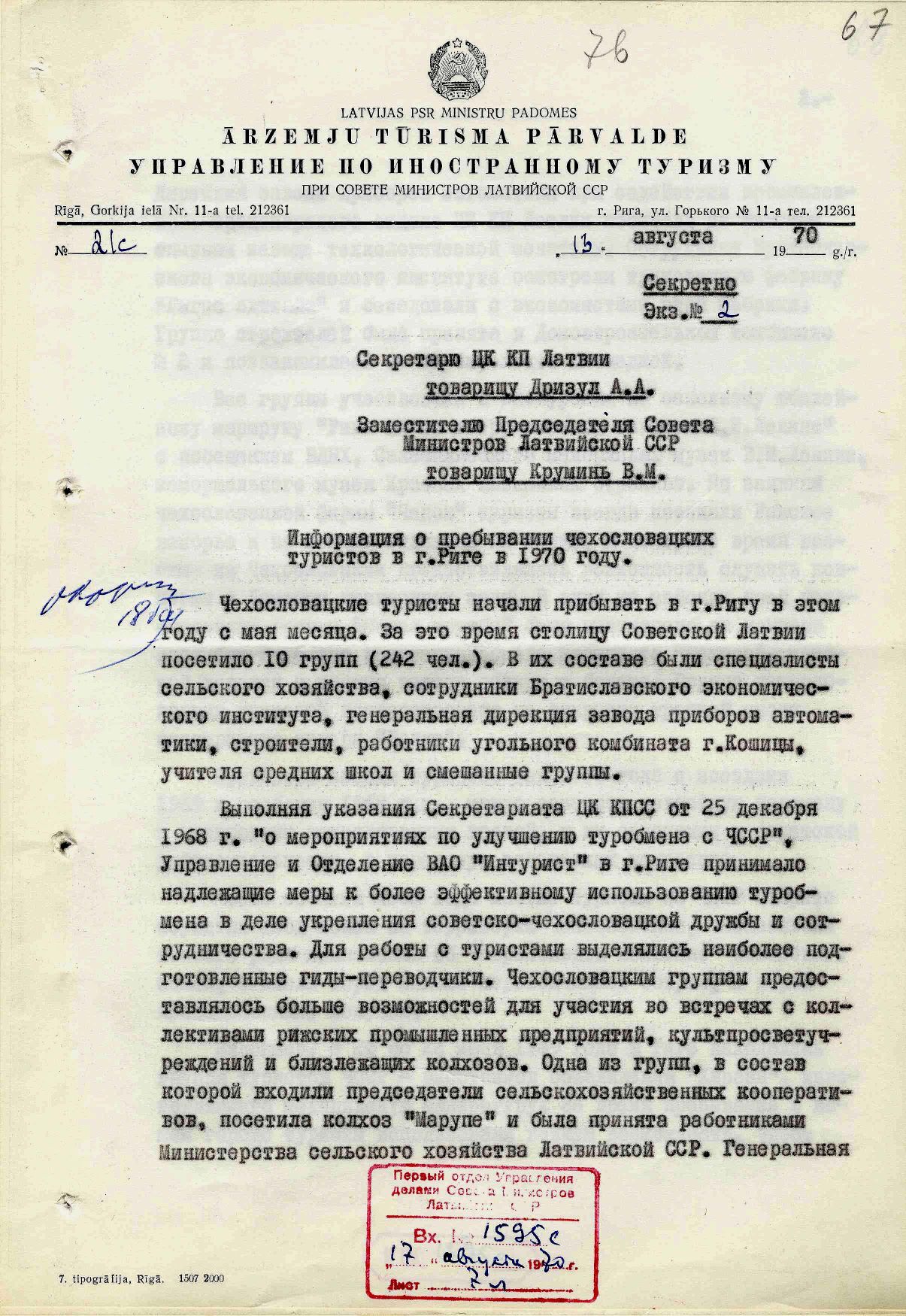 The informative report by Edmunds Ratnieks (chairman of the Latvian SSR Supreme Council Tourism Board) to LCP Central Committee secretary Aleksandrs Drīzulis and vice-chairman of the Latvian SSR Supreme Council Viktors Krūmiņš about the arrival in Riga of Czechoslovak tourists in 1970. The report describes the anti-Soviet mood of individual tourist groups as well as anti-Soviet comments and provocative questions posed to tour guides. One of the tour groups spent evenings by the Freedom Monument, where Ilya Rips set himself on fire in 1969, stating that “we have a club of our own at this site of self-immolation”. The report also states that the Tourist Board will strictly control Czechoslovak tourist groups.