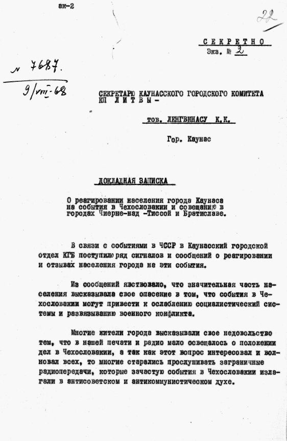 Lietuvas PSR VDK Kauņas daļas vadītāja G. Vaigauska 1968. gada 9. augusta ziņojums par iedzīvotāju attieksmi pret notikumiem Čehoslovākijā 1968. gadā un PSRS ČSSR vadības apspriedi Černā pie Tisas un Varšavas līguma valstu vadītāju apspriedi Bratislavā. Ziņojumā uzsvērts, ka liela sabiedrības daļa izsakot bažas, ka Čehoslovākijas notikumi varot vājināt sociālistisko sistēmu un izraisīt bruņotu konfliktu. Daudzi pilsētas iedzīvotāji esot neapmierināti, ka masu informācijas līdzekļos esot maz informācijas par notikumiem Čehoslovākijā. Vienlaikus atsevišķi cilvēki izteikuši arī viedokli, kas atbalsta Čehoslovākijas vadību un Čehoslovākijas notikumu ietekmē bijuši gatavi cīņai par Lietuvas atdalīšanos no PSRS (arī bruņotas cīņas ceļā). Lietuvas Sevišķais arhīvs, K-1f, 14. apr., 145. l., 22.30. lp.