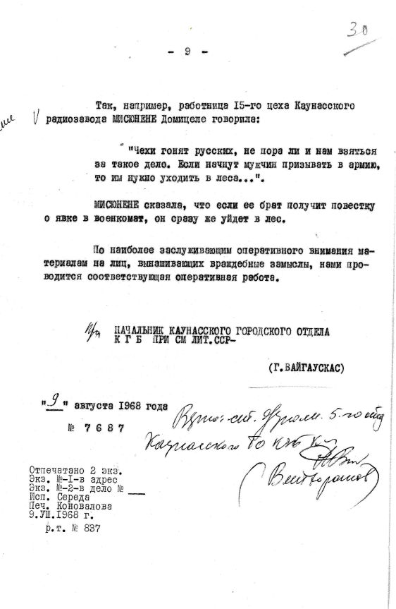 Lietuvas PSR VDK Kauņas daļas vadītāja G. Vaigauska 1968. gada 9. augusta ziņojums par iedzīvotāju attieksmi pret notikumiem Čehoslovākijā 1968. gadā un PSRS ČSSR vadības apspriedi Černā pie Tisas un Varšavas līguma valstu vadītāju apspriedi Bratislavā. Ziņojumā uzsvērts, ka liela sabiedrības daļa izsakot bažas, ka Čehoslovākijas notikumi varot vājināt sociālistisko sistēmu un izraisīt bruņotu konfliktu. Daudzi pilsētas iedzīvotāji esot neapmierināti, ka masu informācijas līdzekļos esot maz informācijas par notikumiem Čehoslovākijā. Vienlaikus atsevišķi cilvēki izteikuši arī viedokli, kas atbalsta Čehoslovākijas vadību un Čehoslovākijas notikumu ietekmē bijuši gatavi cīņai par Lietuvas atdalīšanos no PSRS (arī bruņotas cīņas ceļā). |