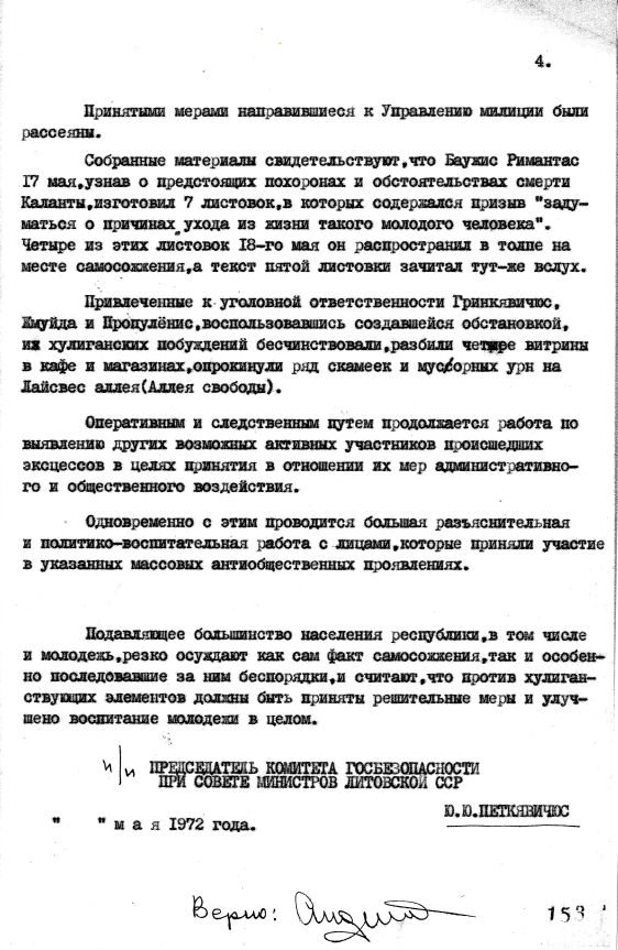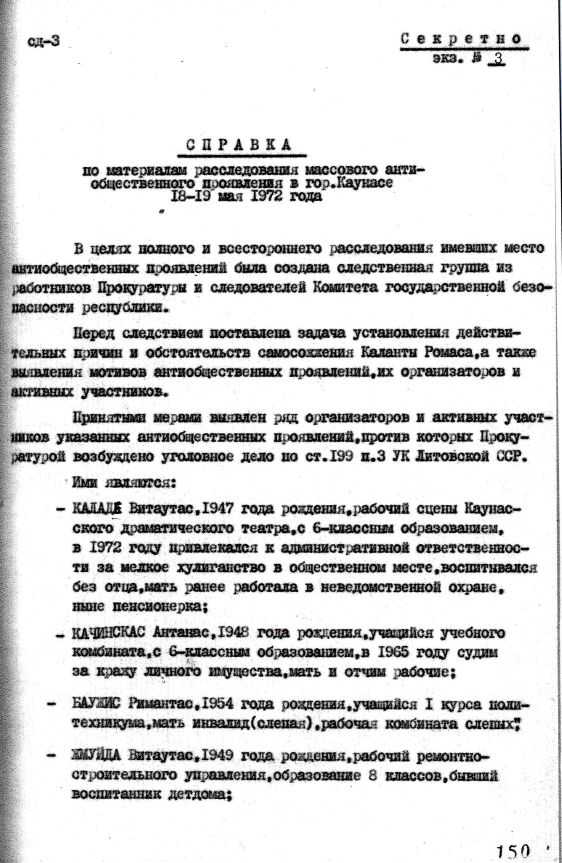 Lietuvas PSR VDK priekšsēdētāja J. Petkeviča izziņa par izmeklēšanu sakarā ar Kauņā 1972. gada 18. un 19. maijā notikušajām demonstrācijām. Izziņā minēts, ka pret vairākiem demonstrācijas organizētājiem un aktīviem dalībniekiem ierosināta krimināllieta. 1972. gada 18. maijā ap 500 jauniešu devušies uz Roma Kalantas, arodskolnieka, kurš pašsadedzinājās, protestējot pret valdošo režīmu, mājām, lai izvadītu viņu uz kapiem. Varas iestādes bēru sākšanās laiku bija tīši mainījušas, un tas jauniešos izraisījis dusmas. Sācies stihisks mītiņš un demonstrācija Kauņas ielās ar saucieniem: Brīvību Lietuvai!, Brīvību jaunatnei!, Brīvību hipijiem!. Demonstranti protestēdami devās uz Kauņas miliciju, taču tur ceļu jauniešiem nobloķēja miliču ķēdes. Lai notušētu pašsadedzināšanās politiskos cēloņus, Romu Kalantu pēc nāves, balstoties uz VDK veiktajām liecinieku nopratināšanām, atzina par psihiski slimu. Lietuvas Sevišķais arhīvs, K-1. f., 3. apr., 793. l., 150.153. lp.