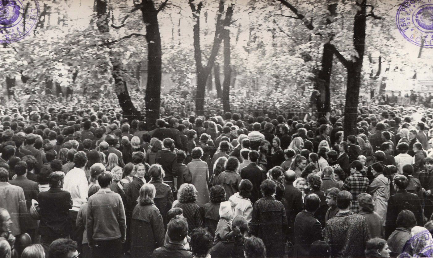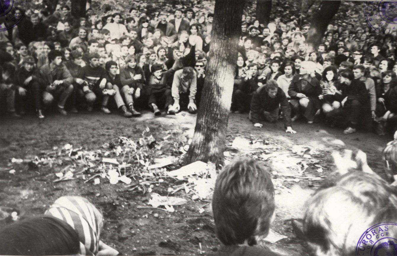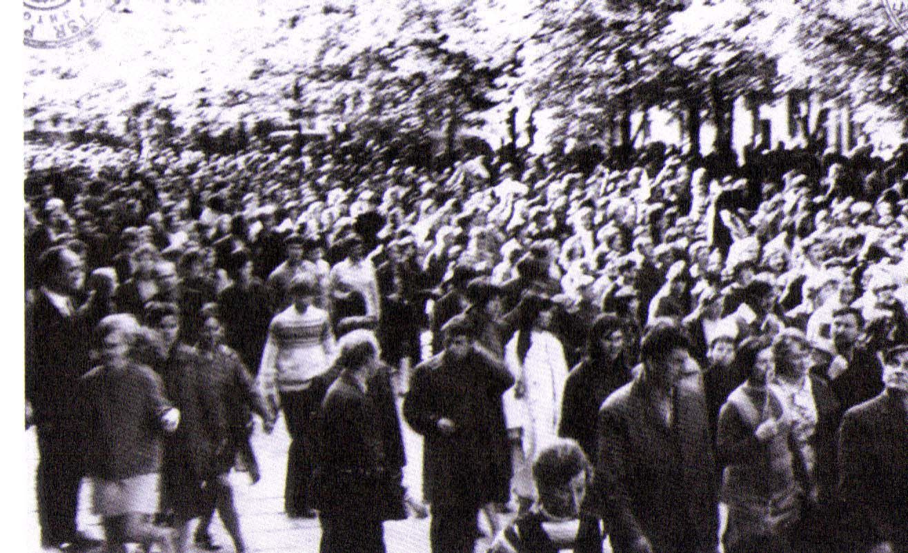Demonstranti Kauņā 1972. gada 18. maijā Romas Kalantas pašsadedzināšanās vietā Muzikālā teātra parkā. |