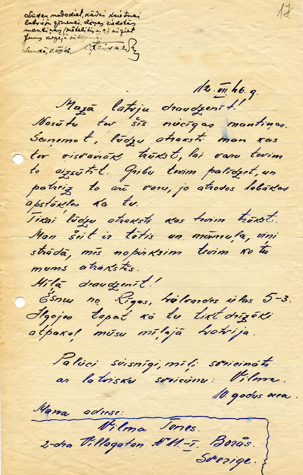 | Vilmas Tenes vēstule no Zviedrijas. 1946. gads. LVA, 2176. f., 2v. apr., 106. l., 17. lp. |