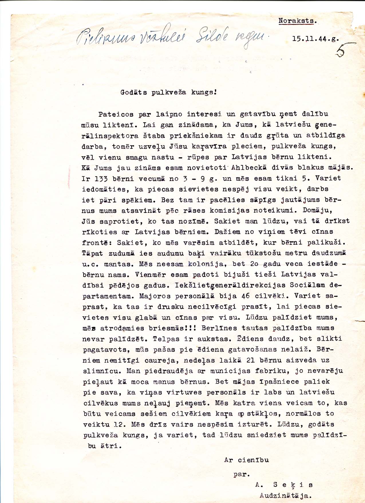 | Audzinātājas A. Seķes vēstule A. Šildem . 1944. gada 15. novembris. LVA, 2176. f., 2v. apr., 107. l., 5. lp. |