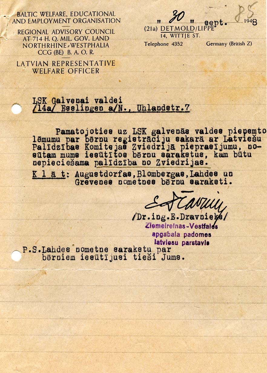 | Ziemeļreinas-Vestfāles apgabala padomes latviešu pārstāvja E. Dravnieka ziņojums par bērniem, kuriem nepieciešama palīdzība no Zviedrijas. 1948. gada 30. septembris. LVA, 2176. f., 2v. apr., 113. l., 85. lp. |