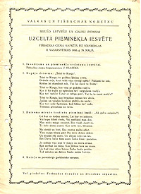 | Mirušo latviešu un igauņu piemiņai uzceltā pieminekļa Fišbahas ciemā pie Nirnbergas iesvētīšanas lapiņa. 1950. gada 29. maijs. LVA, 2335. f., 1. apr., 372. l., 68. lp. |