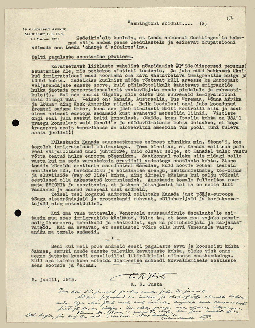 | Remarks about Red Cross by Karl Robert Pusta while visiting Washington from June 27 to July 4, 1945. ERA.1583.2.25, page 66–67 (digitized, www.ra.ee/saaga) |