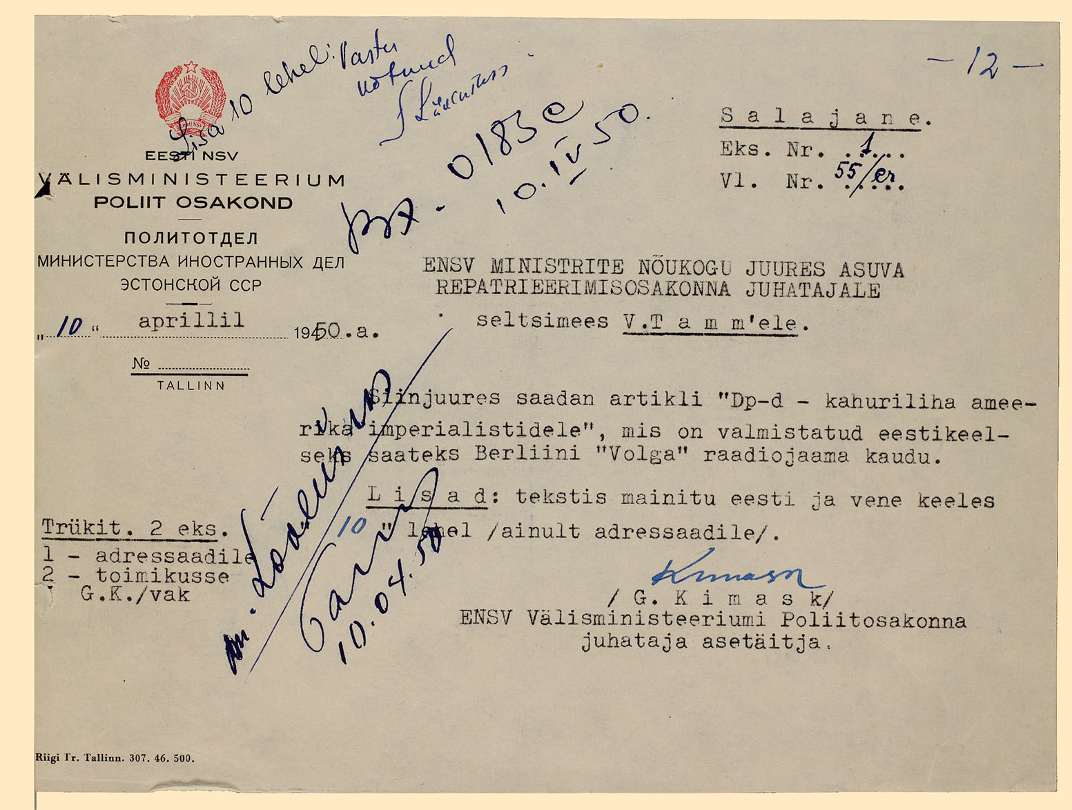 A covering letter of political department of Estonian SSR to the article of "DPs – cannon fodder for American imperialists". The article was planned to publish in an Estonian broadcast of radio station "Volga" in Berlin. April 10, 1950.