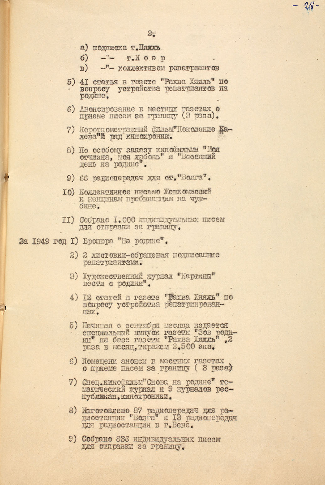 A circular letter of repatriation department of Estonian SSR Council of Ministers to the relevant distribution locations there is referred that every repatriate must write letters to the Estonians abroad for to activate the repatriation. Also, there are included lists of repatriates county by county in the letter.