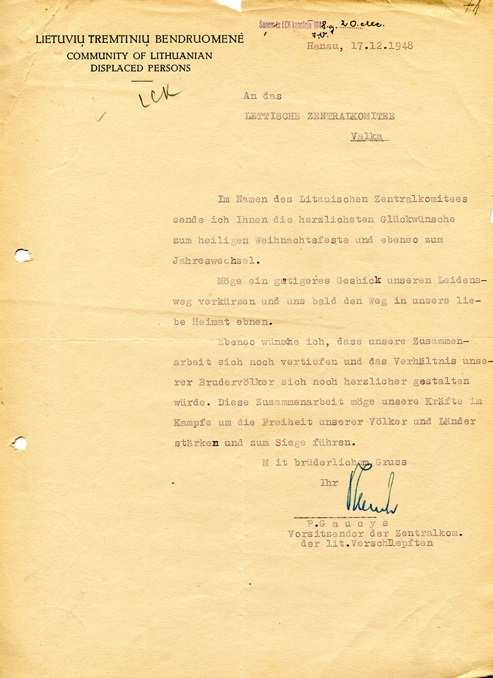 Lietuviešu pārvietoto personu kopienas apsveikums Latviešu Centrālajai komitejai. 1948. gada 17. decembris.
