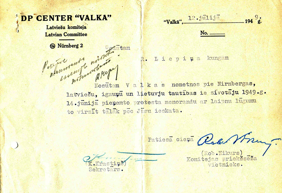 Bēgļu nometnes "Valka" Latviešu komitejas vēstule. 1949. gada 12. jūlijs.