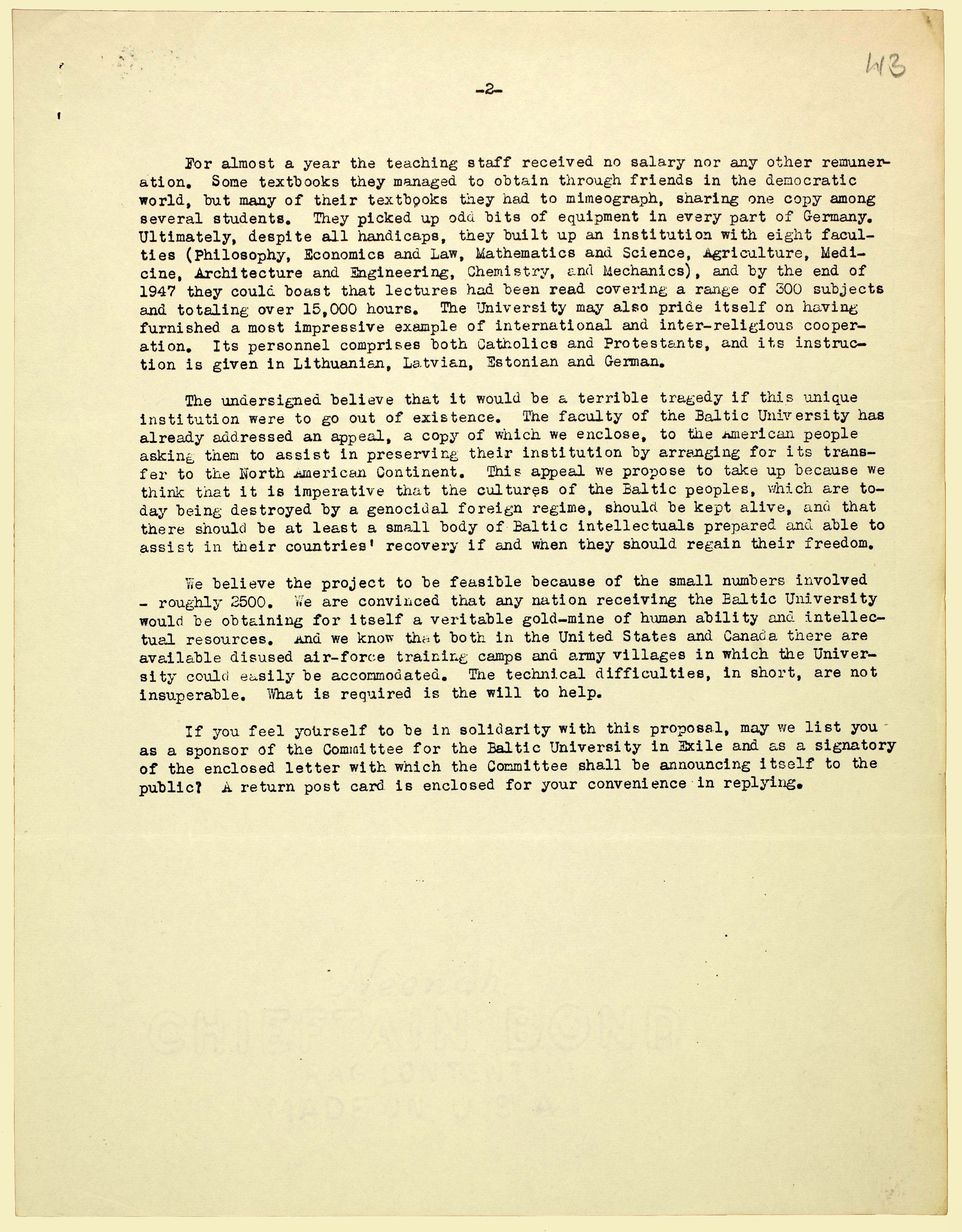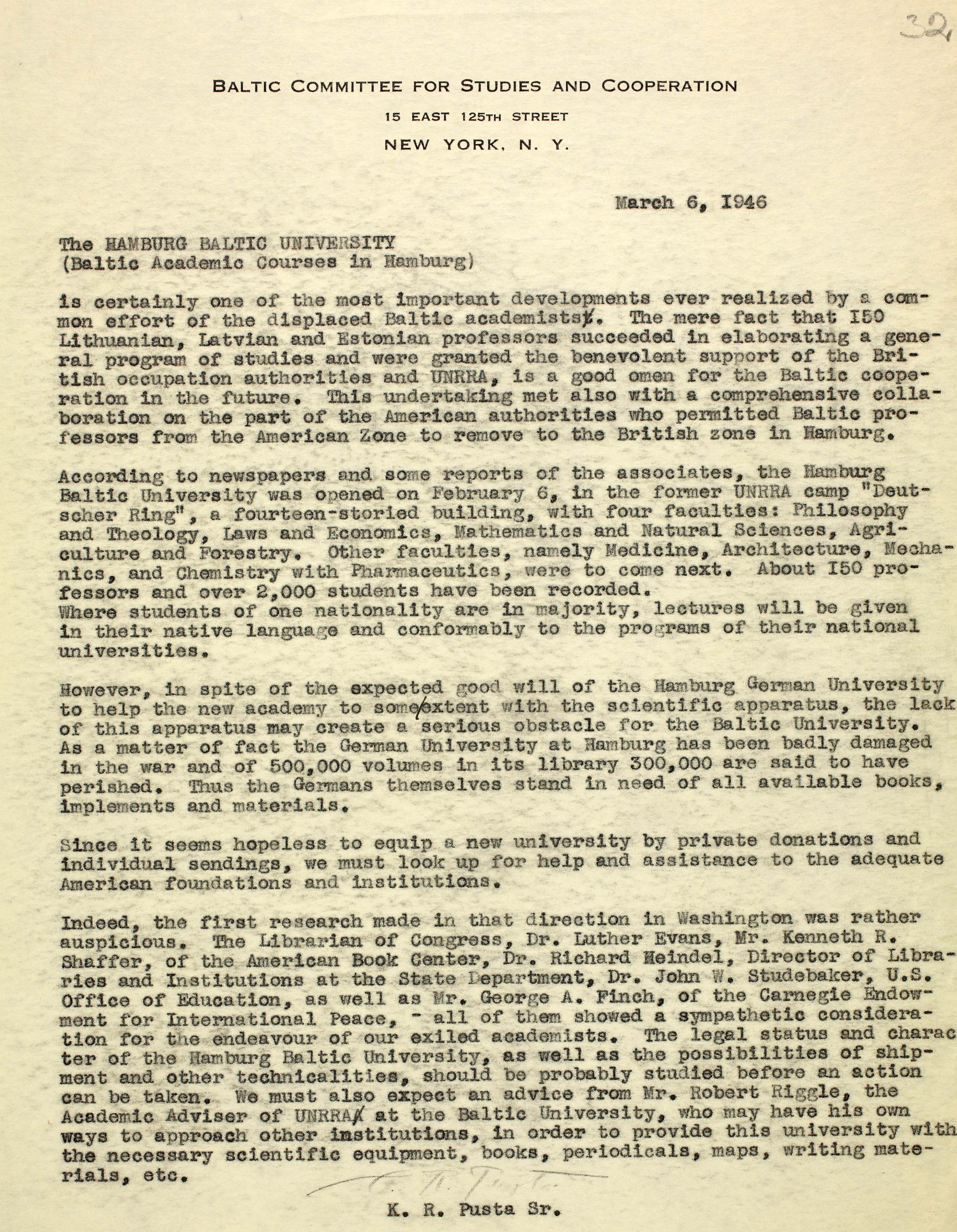 | Karl Robert Pusta kiri 6. veebruaril 1946 Hamburgis avatud Balti Ülikooli tegevuse edasisest rahastamisest. Ülikool alustas 150 professori ja 2000 tudengiga ning õppetöö toimus neljas teaduskonnas: filosoofia ja teoloogia teaduskond, õigus- ja majandusteaduskond, matemaatika ja loodusteaduste teaduskond, põllumajandus- ja metsandusteaduskond. ERA.1608.2.949, lk 32 (digiteeritud, www.ra.ee/saaga) |