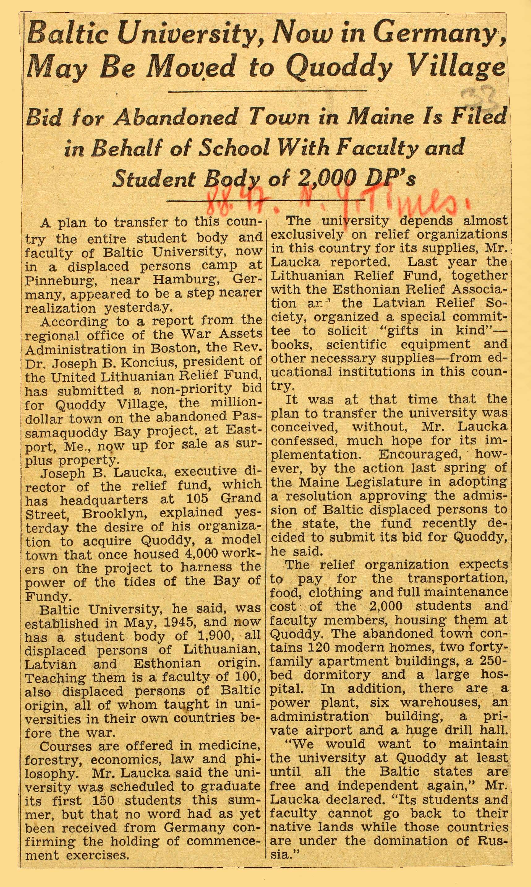 | Ajalehes "The New York Times" 8. augustil 1947 avaldatud artikkel Balti Ülikooli kohta. ERA.1608.2.949, lk 33 (digiteeritud, www.ra.ee/saaga) |