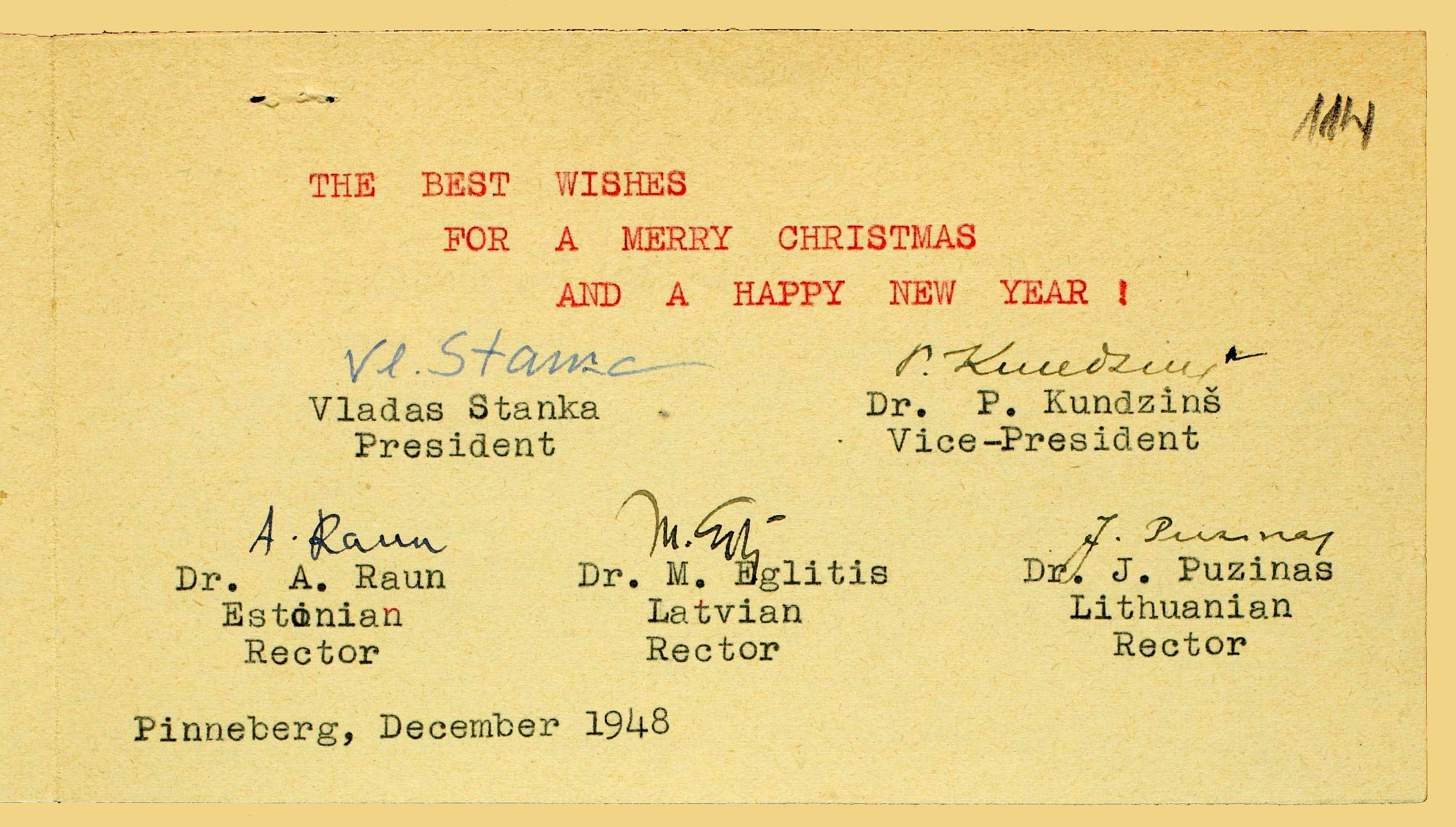 | Balti Ülikooli rektorite, presidendi ja asepresidendi uusaastatervitus. Pinneberg, 1948. ERA.1608.2.949, lk 114 (digiteeritud, www.ra.ee/saaga) |