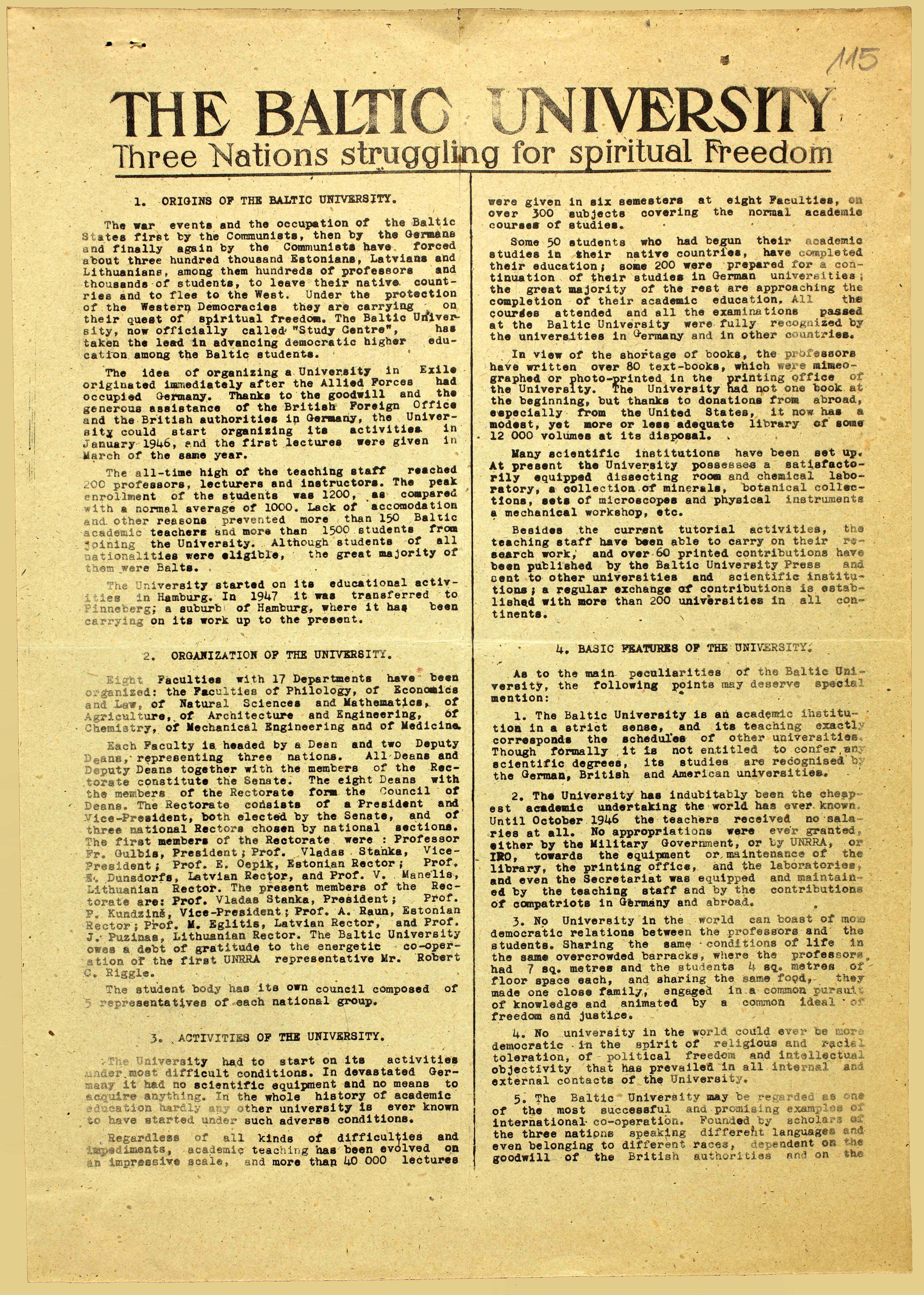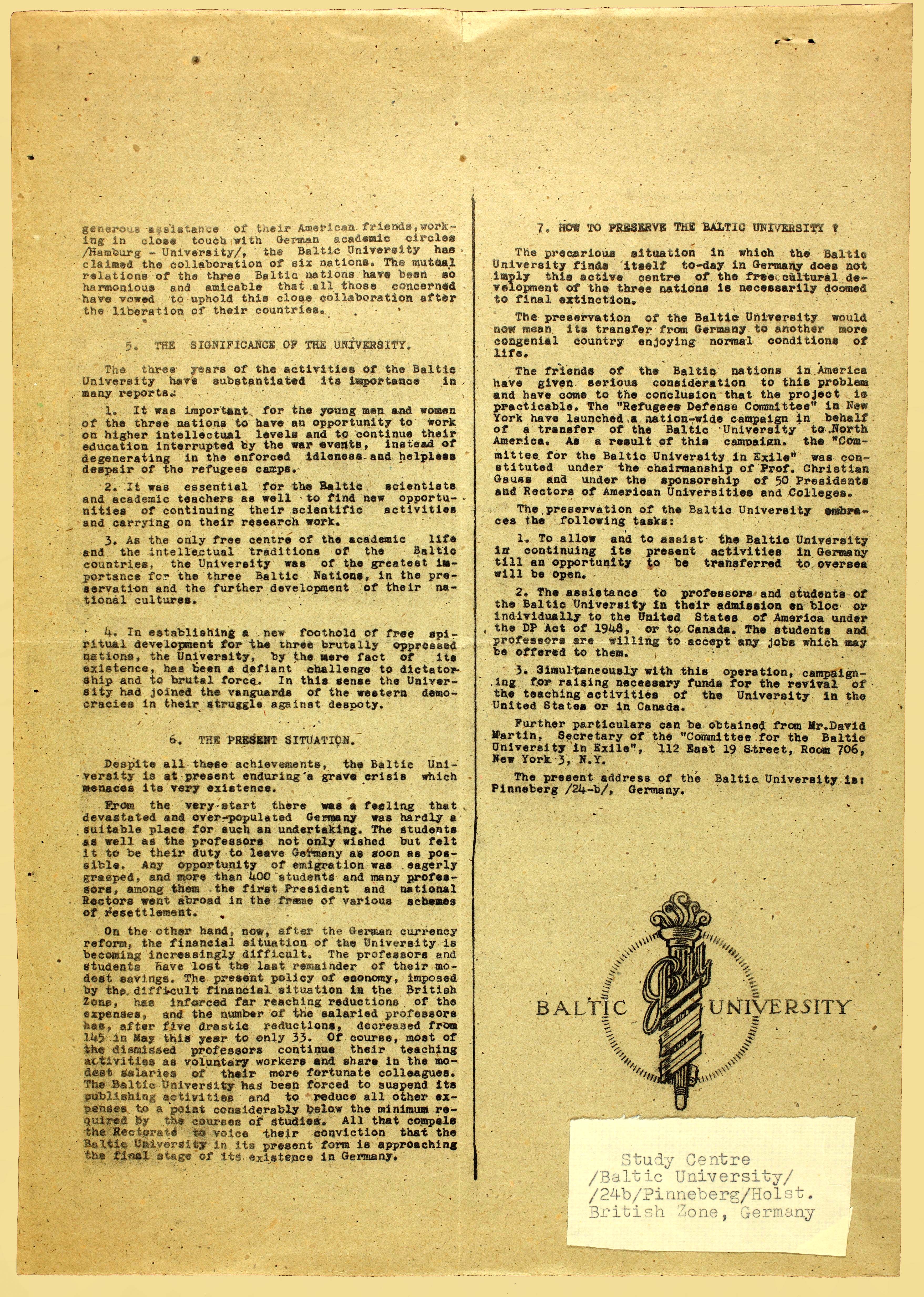 | Ülevaade Balti Ülikooli loomisest, tegevusest ja organisatsioonilisest ülesehitusest. Majanduslikest raskustest väljapääsemiseks näeb Balti Ülikool lahendusena võimalikku üleviimist Ameerika Ühendriikidesse või Kanadasse. ERA.1608.2.949, lk 115–116 (digiteeritud, www.ra.ee/saaga) |