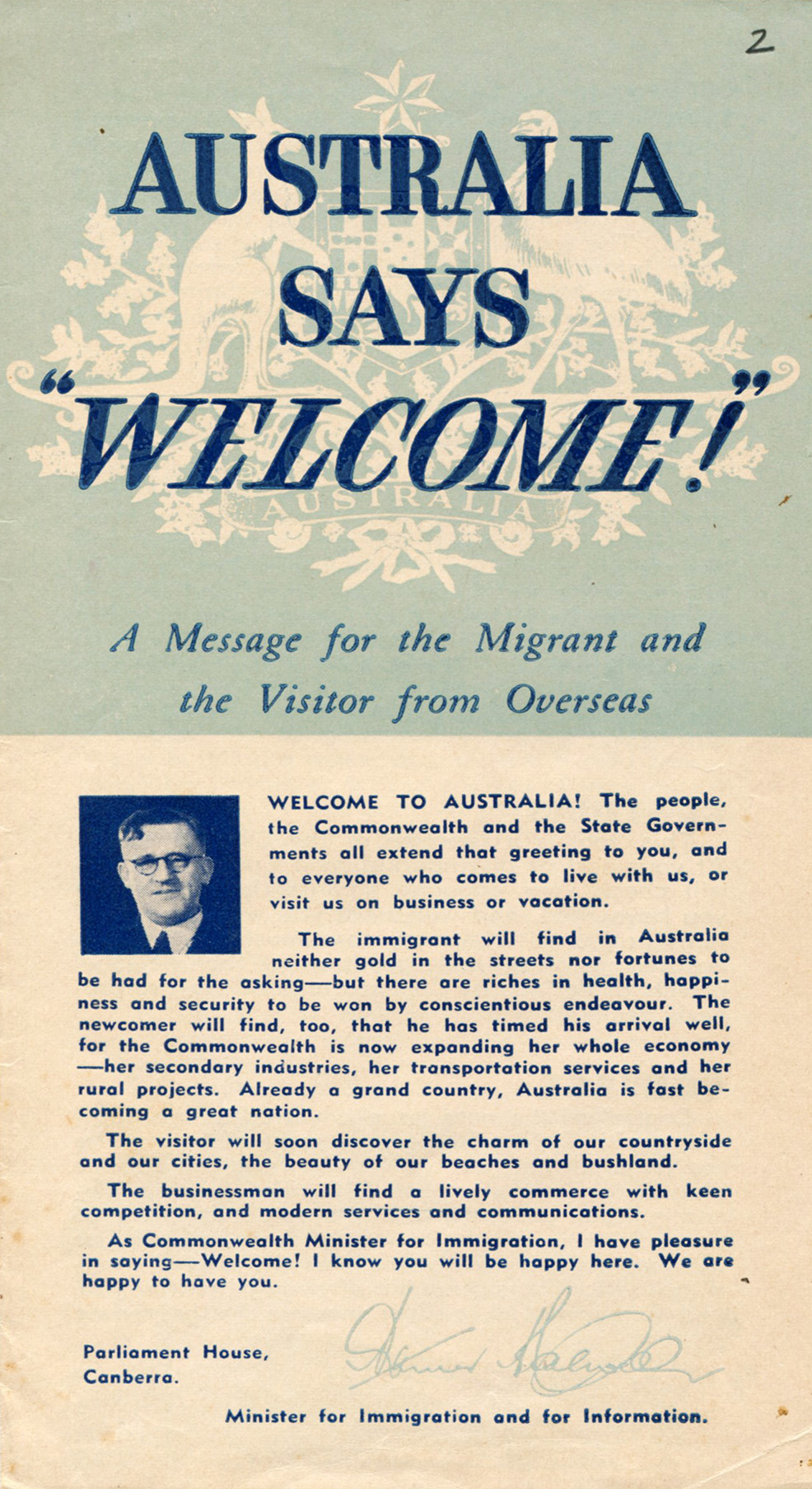 | Austrālijas imigrācijas un informācijas ministra aicinājums. LVA, 2250. f., 29v. apr., 6. l., 2. lp. |
