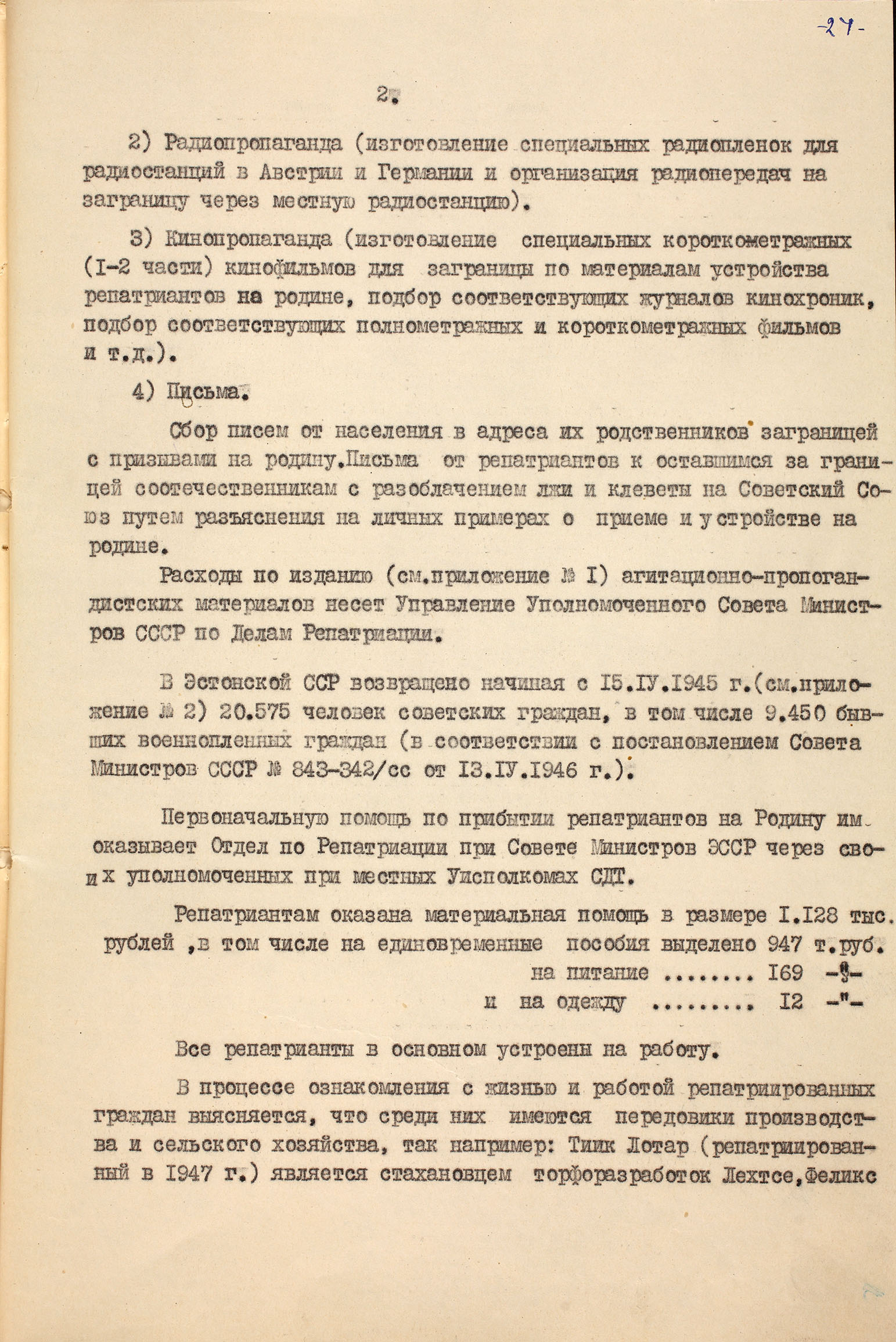 A circular letter of repatriation department of Estonian SSR Council of Ministers to the relevant distribution locations there is referred that every repatriate must write letters to the Estonians abroad for to activate the repatriation. Also, there are included lists of repatriates county by county in the letter.