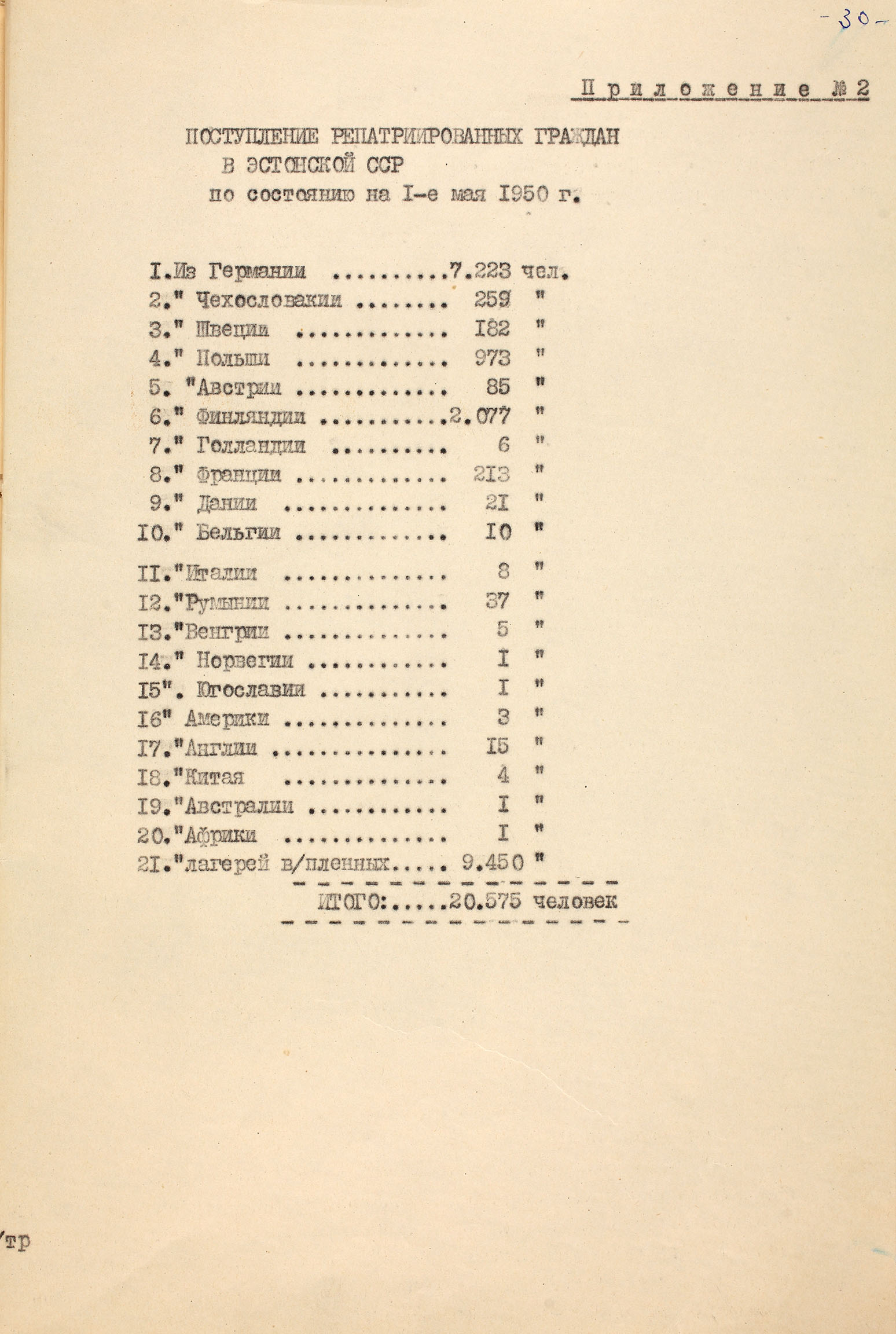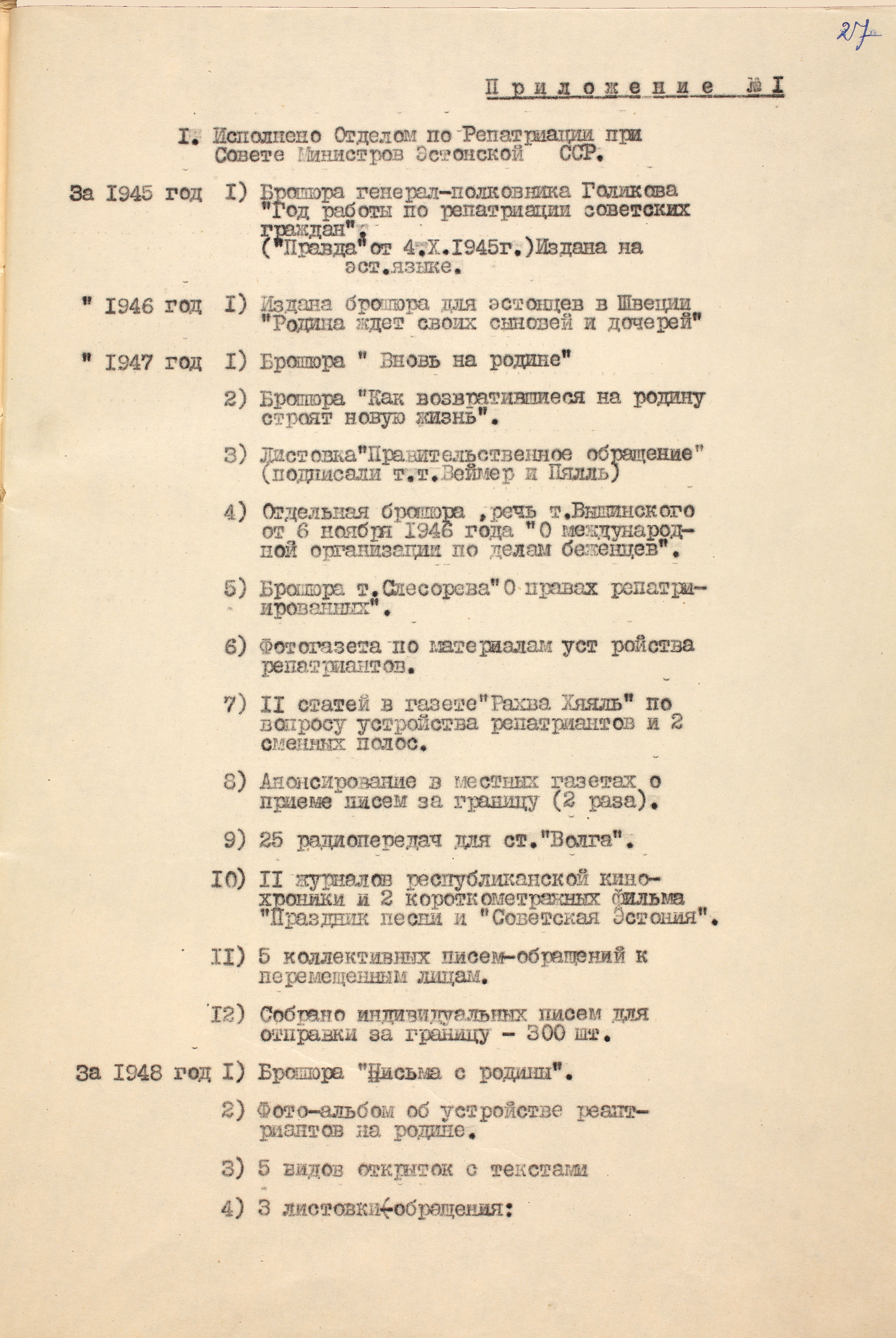 A report of repatriation department of Estonian SSR about the period of April 15, 1945 – May 1, 1950. In addition, there are a list of propaganda materials as well as statistical information of repatriates country by country in the relevant report.